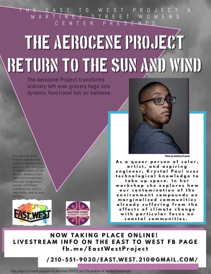 Due to the unforeseen waves of changes that are currently taking place on our lands and the effects that these impose on our bodies, we will no longer be gathering in person for the inauguration of the East to West Project. “The Aerocene Project: Return to Sun and Wind,” a workshop by Krystal Paul originally scheduled for Saturday, March 21, 2020 from 6 p.m. to 8 p.m. at the Martinez Street Women’s Center (801 N. Olive Street, San Antonio 78202), will now take place on Facebook Live. Please join us for a presentation, workshop, and discussion made possible online by Deceleration News. Feel free to invite others to join as well from the privacy of their own screens. We hope to create an interactive experience with multiple layers of engagement for your creative, intellectual, and spiritual fulfillment. Starting at 6pm CST, the link to the live stream will be available on each of the pages below: