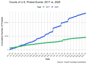 Our ongoing research on protests in the United States reveals that within the first two weeks of the second Trump administration, protest activity surpassed that of 2017. By the end of March 2025, there had been three times as many protests as had taken place in 2017.