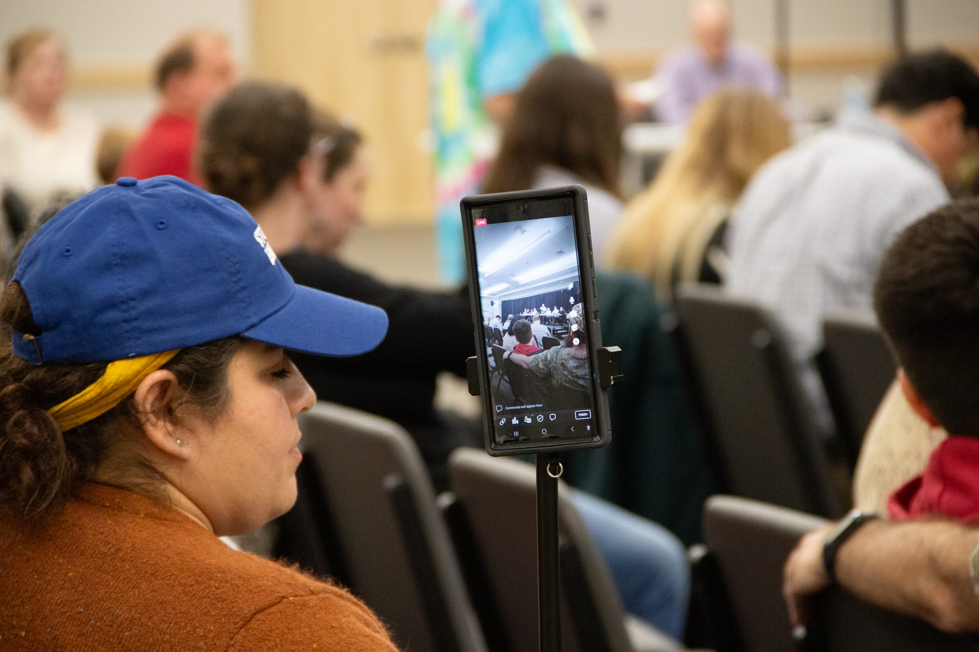 Despite Enbridge’s significance within the American crude oil export industry, no other media is present, a common complaint of residents who feel overlooked and have to do their legwork to get the news out. Castillo straps her phone on a tripod and streams the meeting on Facebook.