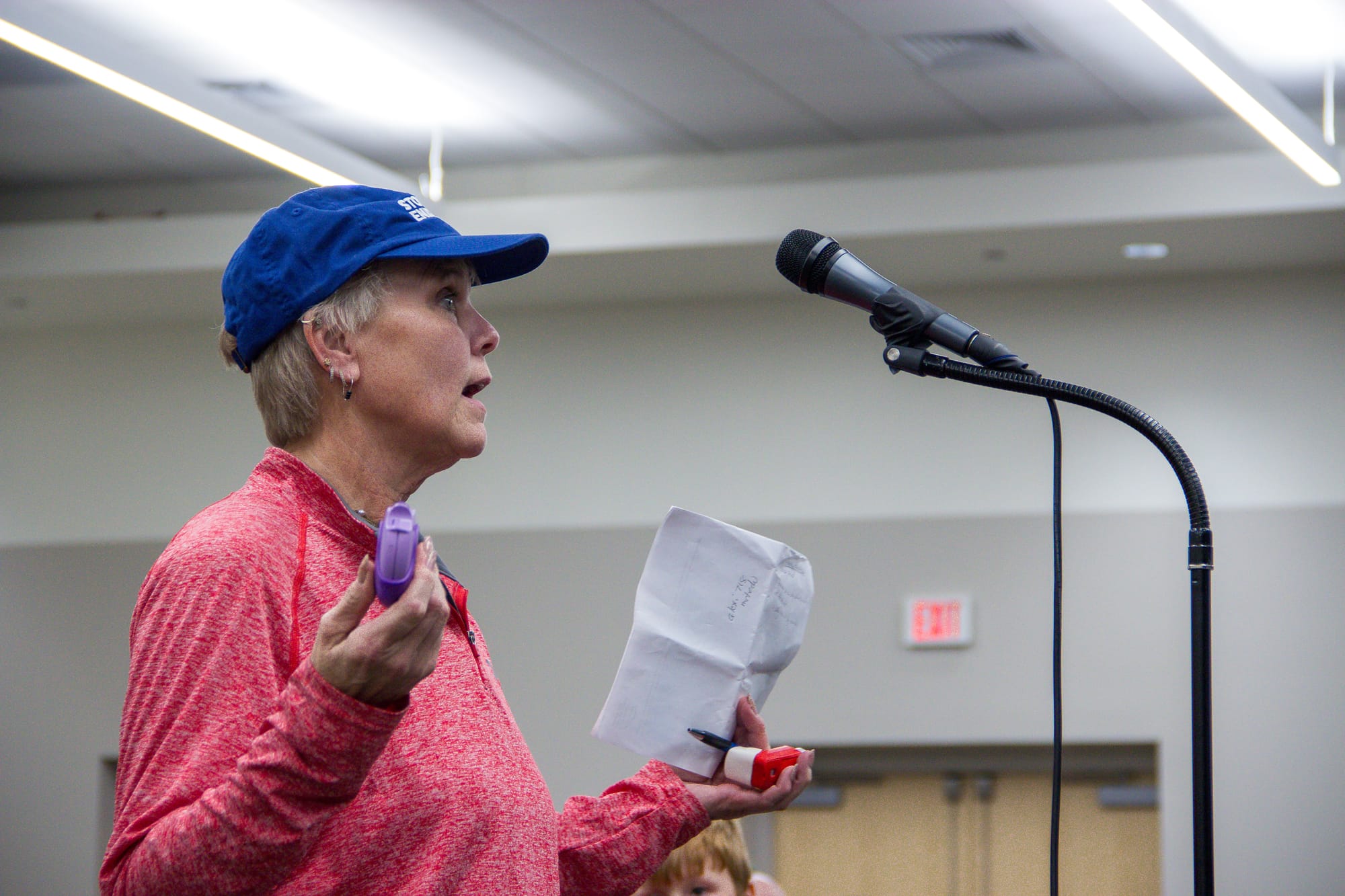 Wearing a blue “Stop Enbridge” cap, inhalers in her hands, it’s Porter’s turn. “I’d like to thank you that now at 63, I have two inhalers,” she says.