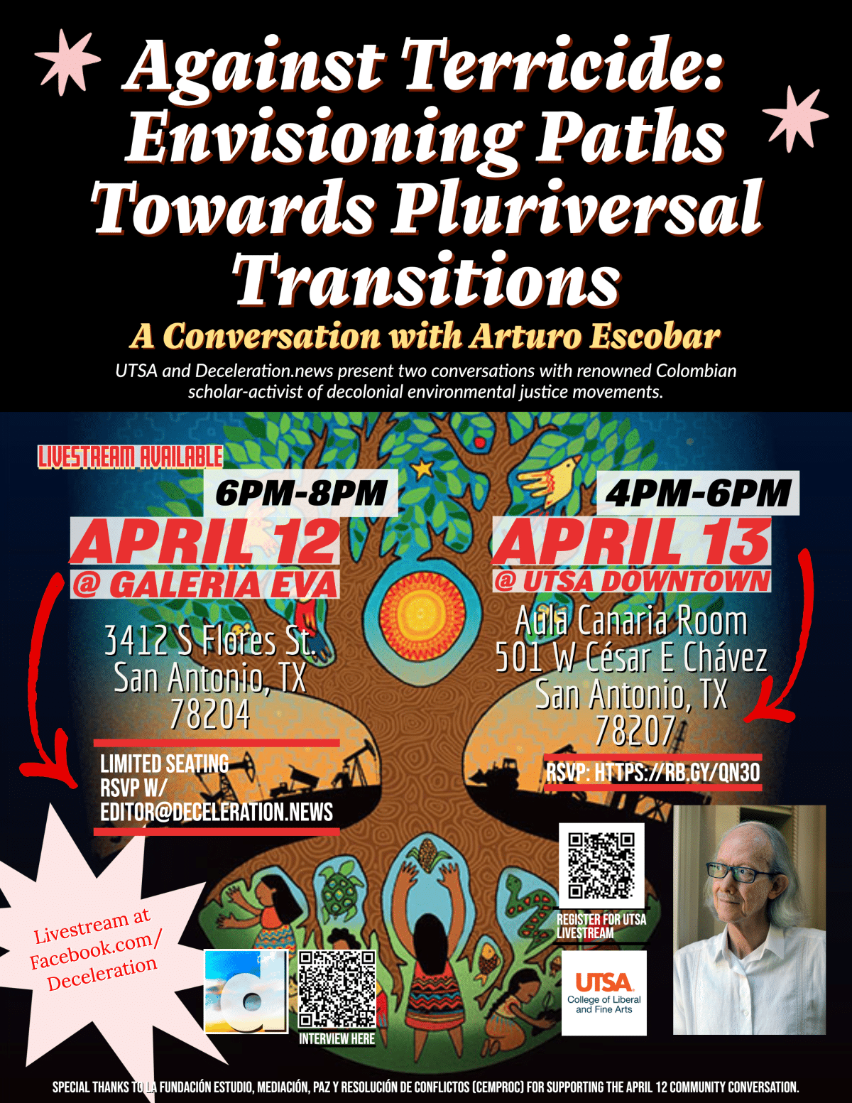 Deceleration is beyond excited to welcome Dr. Arturo Escobar, a renowned Colombian scholar-activist, to San Antonio for a series of community exchanges about his work and our own—meaning all of us who work to decolonize relationships to land and each other, whether in movements or in the university.