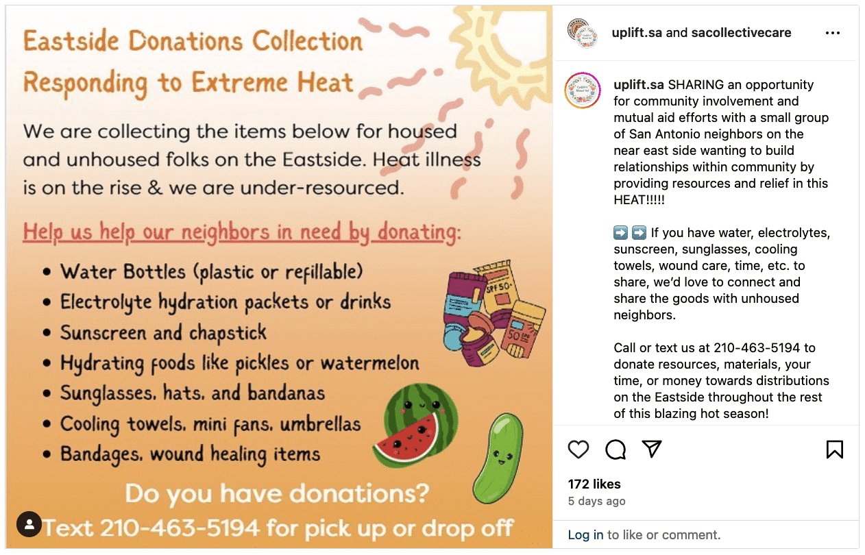 Toward that end, we wanted to provide a round up of grassroots and neighborhood-based mutual aid efforts that have blossomed in recent months in response to extreme heat in San Antonio, including calls for direct support for anyone wondering how they can help sustain these efforts. Here are just a few we know of; if you hear of others we should add to the list, email us at editor@deceleration.news.
