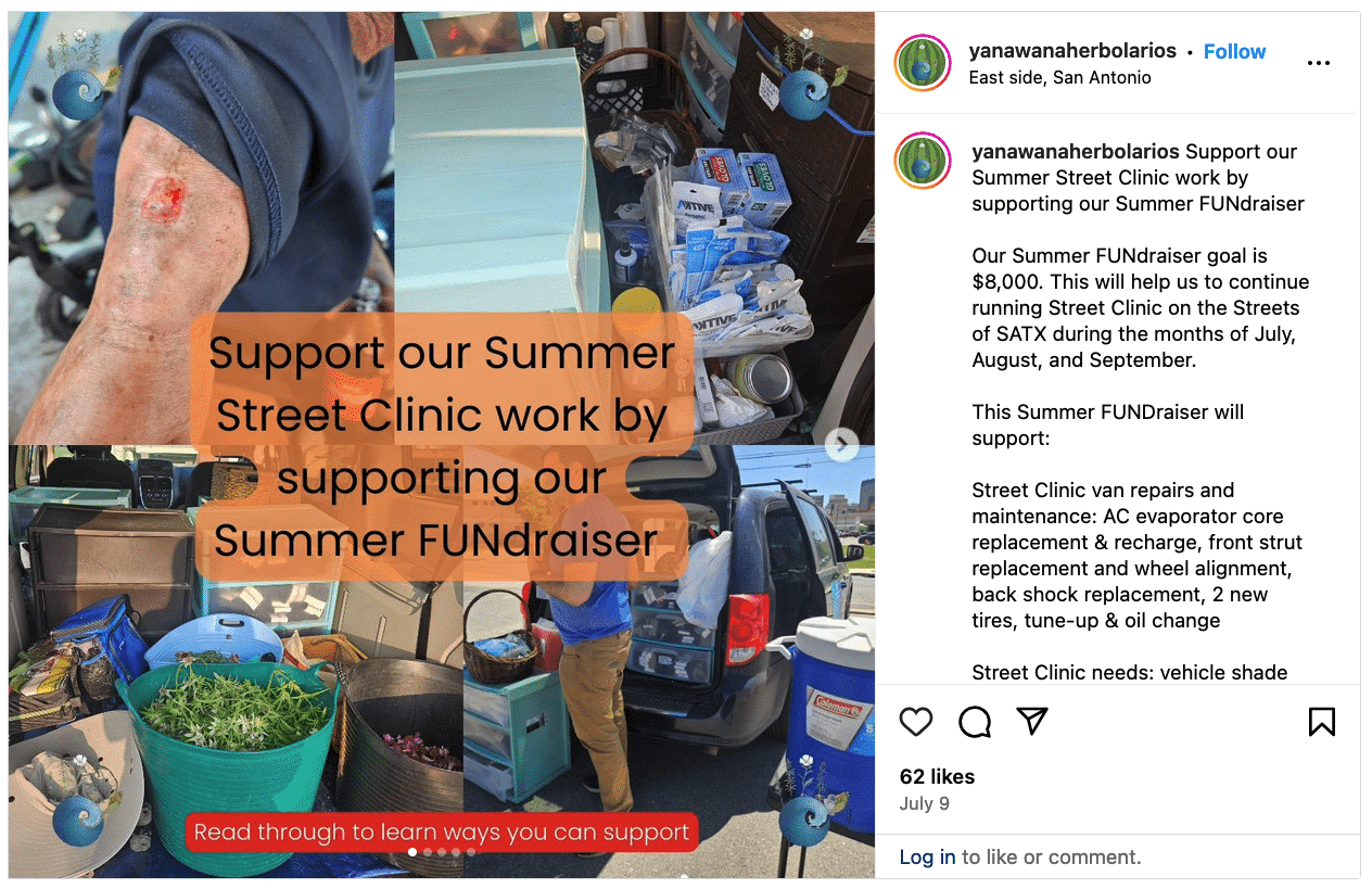 Yanawana Herbolarios is seeking to raise funds to sustain their mobile street clinic efforts during the hottest part of the year. This street clinic serves unhoused neighbors around the city who are among the communities most impacted by heat yet are frequently ignored in the city’s preparedness planning. This summer, YH’s biggest need is to fix the a/c in their clinic van so that medics can complete their rounds safely, and to install van awnings to provide shade for clients and medics as they provide care. If you or your neighbors have been helped by YH’s street outreach team or are looking for ways to meet the needs of unhoused neighbors, consider supporting this work here–see Insta post above on how you can do this.