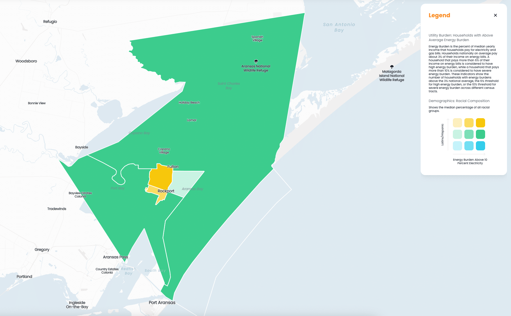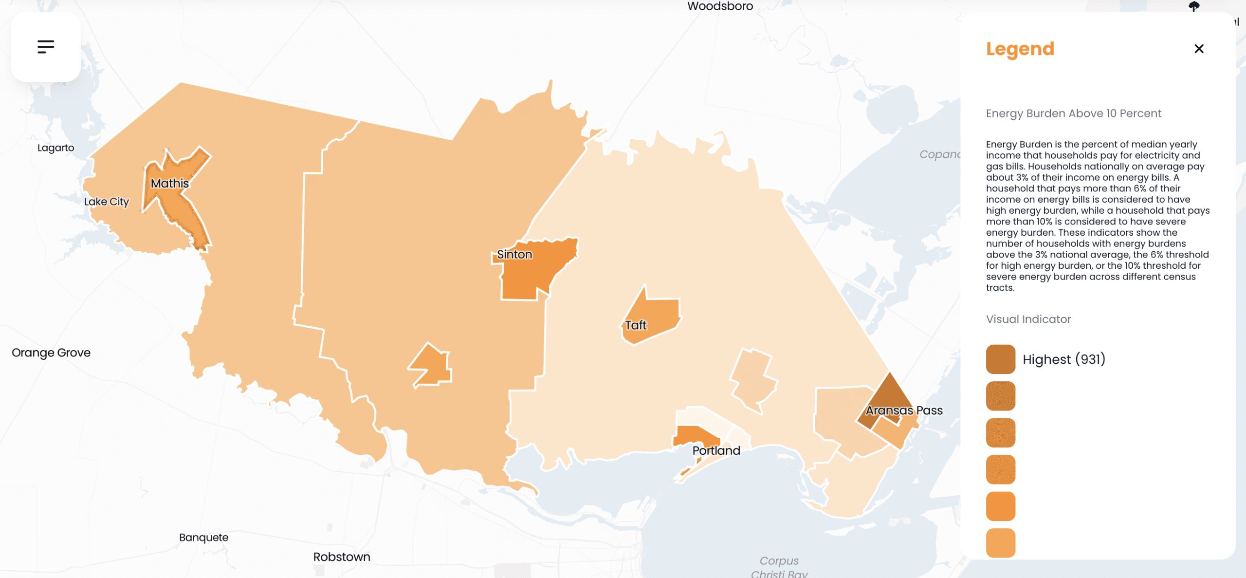 Largest correspondance of race and utility burden occurs in San Patricio predominantly in areas with Latinx/Hispanic-heavy colonias, such as Mathis is (90.7 percent Latinx/Hispanic), Sinton (78 percent), and Taft (85 percent).