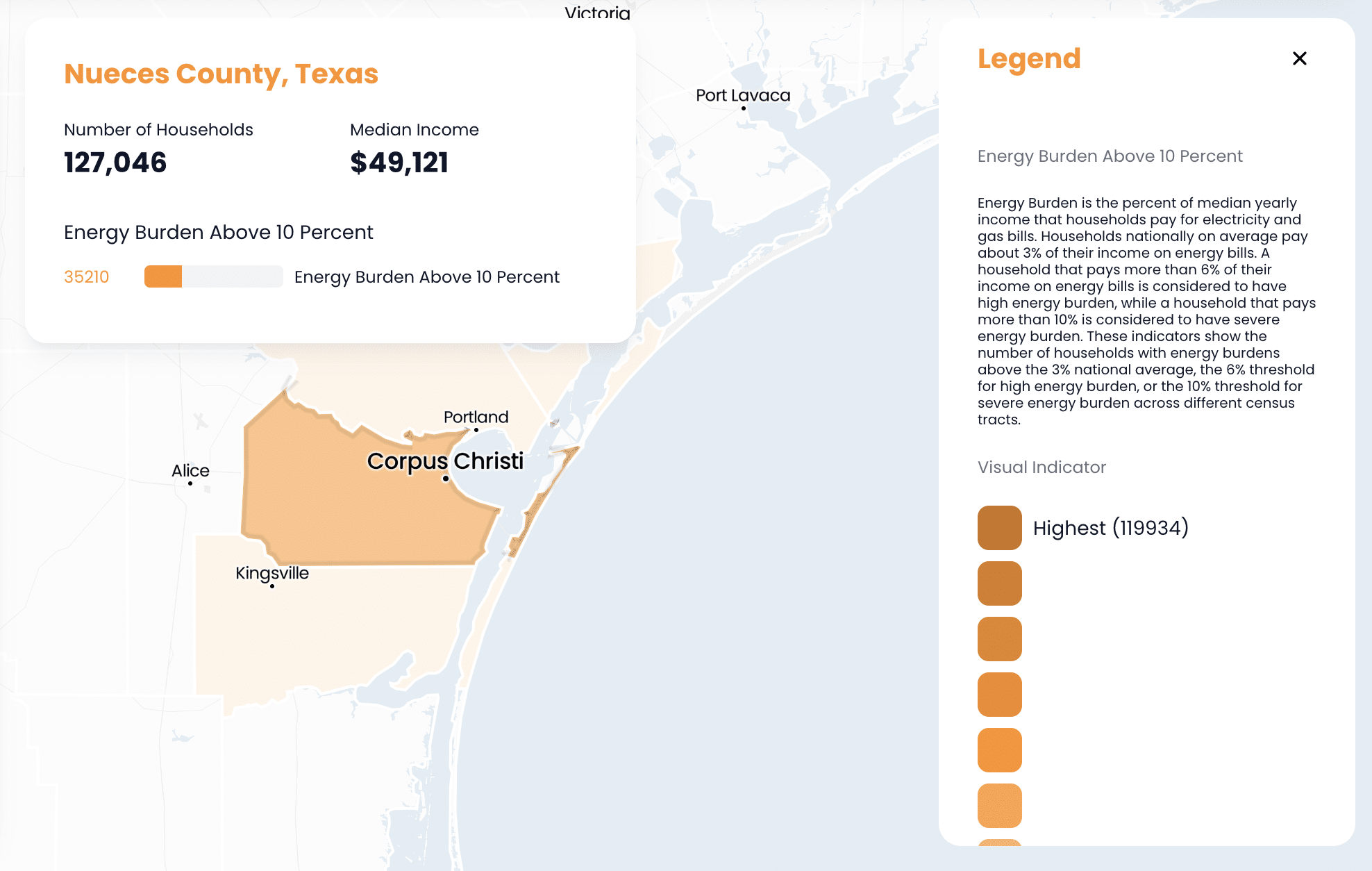 Due to its much larger population, Nueces County has far more households experiencing severe utility burden (considered over 10 percent of annual income).
