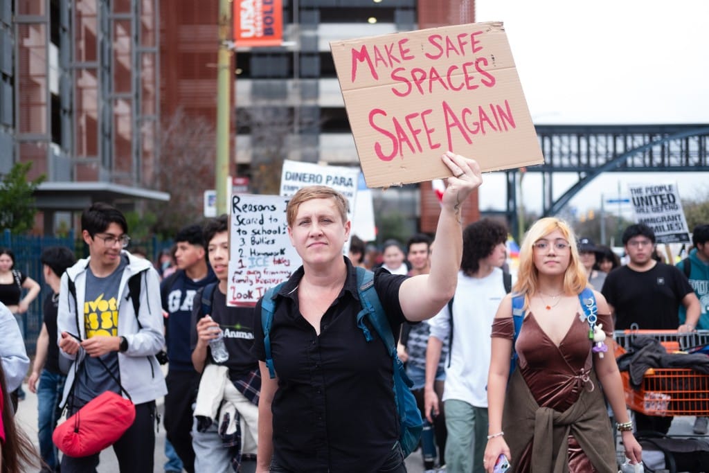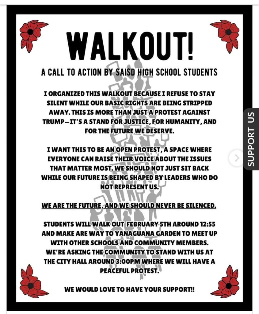 Cientos de estudiantes de varios campus del centro de San Antonio abandonaron las clases hacia la 1 de la tarde del miércoles 5 de febrero de 2025, como parte de una «protesta abierta», una postura «por la justicia, por la humanidad, por el futuro que merecemos». Primero se reunieron en Yanaguana Gardens, en Hemisfair Park, antes de tomar las calles de la ciudad en una marcha hasta el Ayuntamiento de San Antonio, donde varios dirigentes electos se solidarizaron durante un tiempo antes de dar comienzo a una reunión programada en el interior.