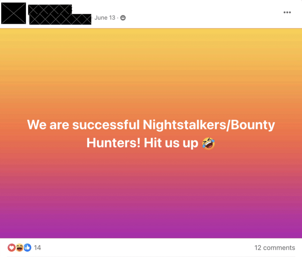 «¡Somos acechadores nocturnos/cazadores de recompensas con éxito! Llámanos».