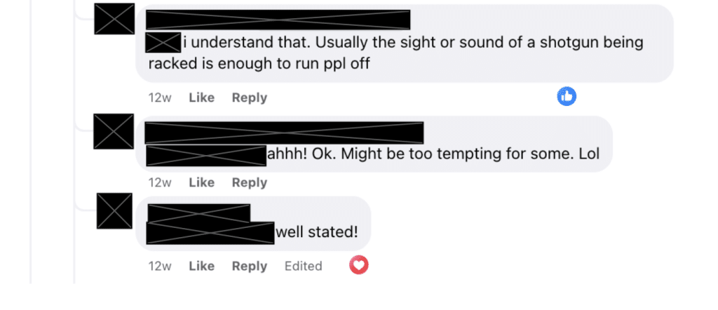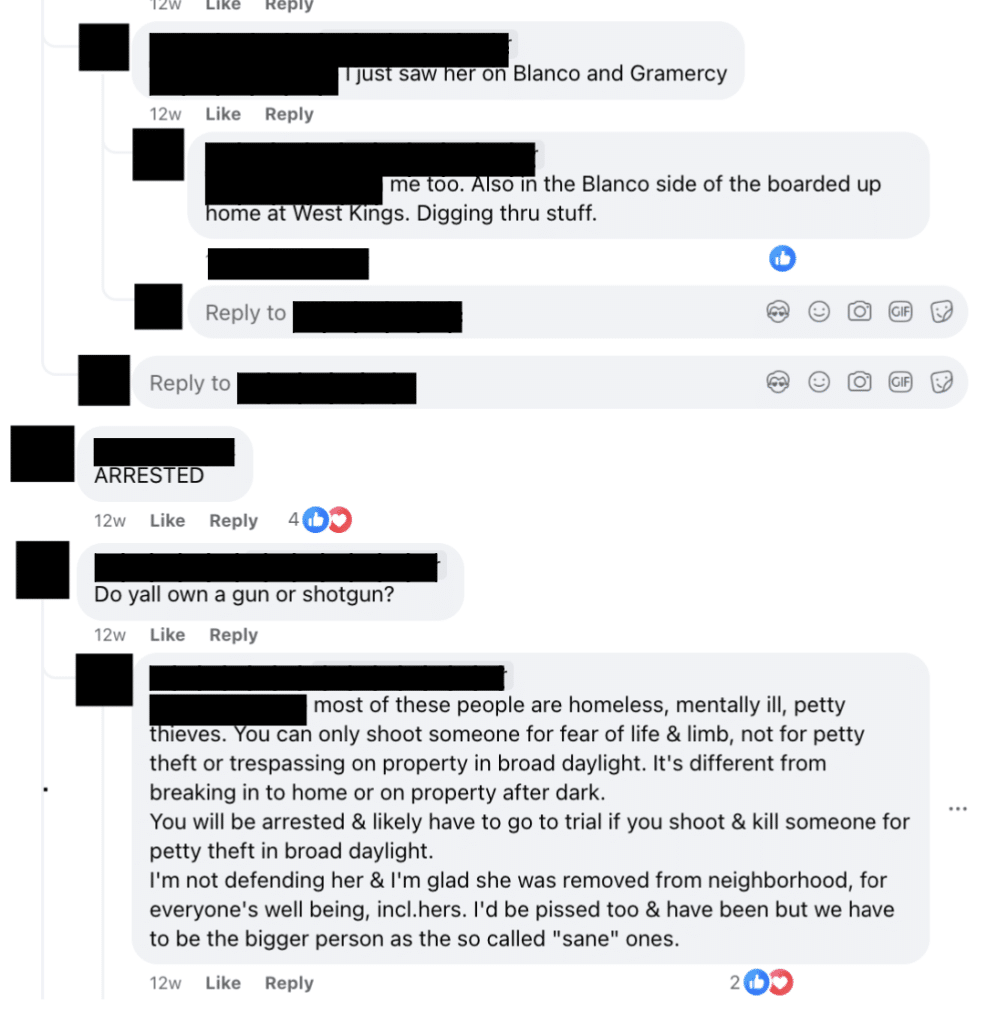 Las capturas de pantalla de un grupo de Facebook del barrio la noche de la detención final de Witzel, el 13 de junio, muestran a algunos residentes alojados llevando estas actitudes a su conclusión lógica. Aunque contrarrestados por otros que instaban a mantener la cabeza fría o a buscar soluciones más preliminares («¿y si simplemente diéramos a la gente lo que necesita en lugar de intentar arrestarla para salir del problema?»), algunos miembros del grupo insinuaron violencia la noche en que la detuvieron por robar 53 alfileres de metal y una caja de hierro.
