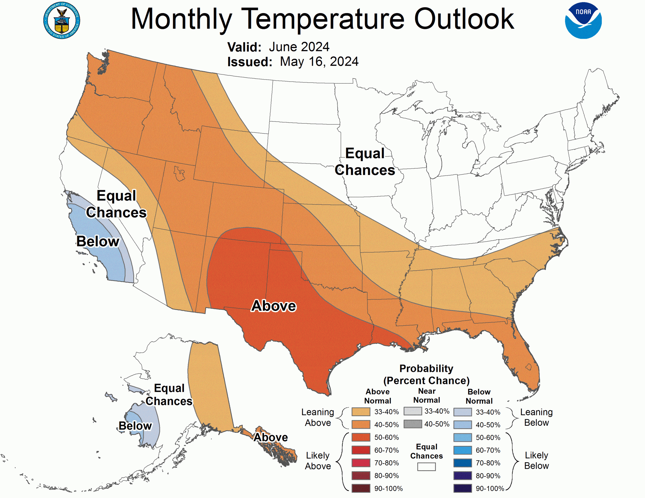NOAA Seasonal Temperature Outlooks for June through October, 2024.
