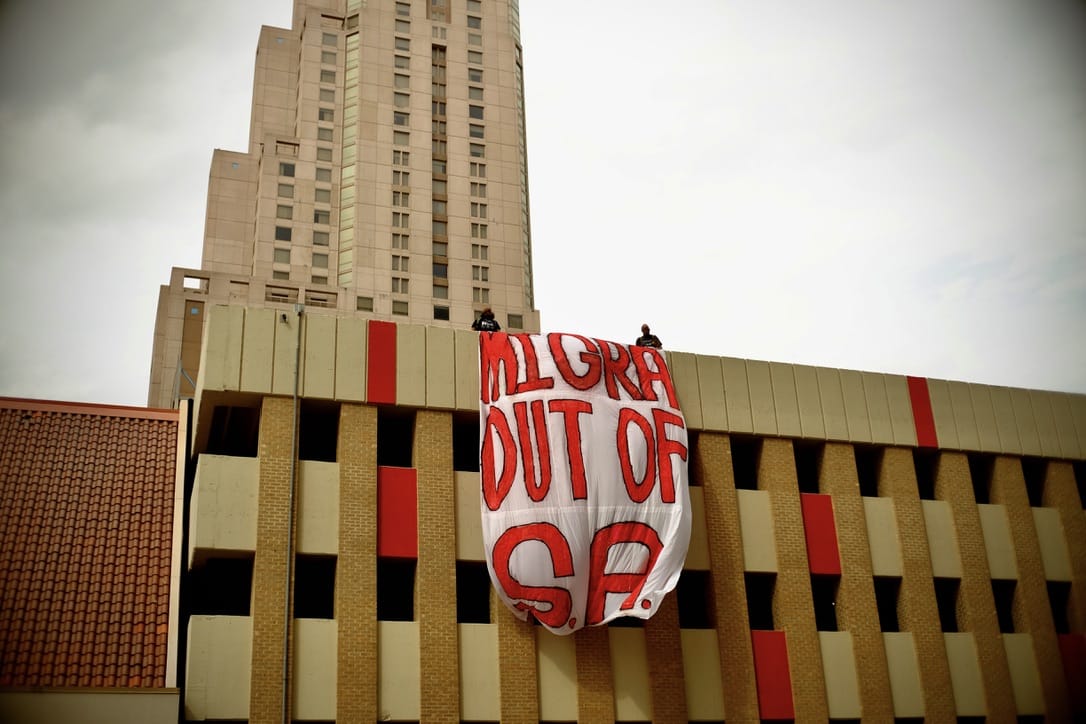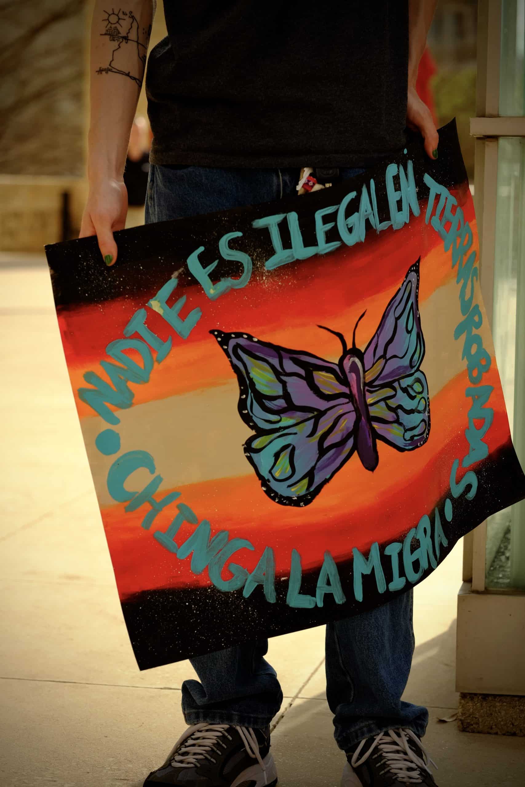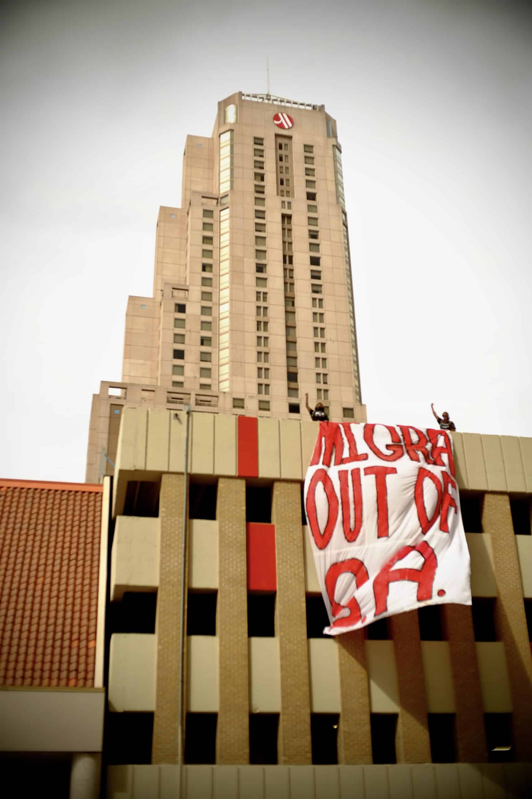 Mientras los residentes locales reunidos debajo comenzaban a cantar, se desplegó una enorme pancarta desde lo alto del estacionamiento de Grand Hyatt SA en el centro de San Antonio. Los vítores subieron. Altísimas letras rojas decían: «Migra Out of SA».