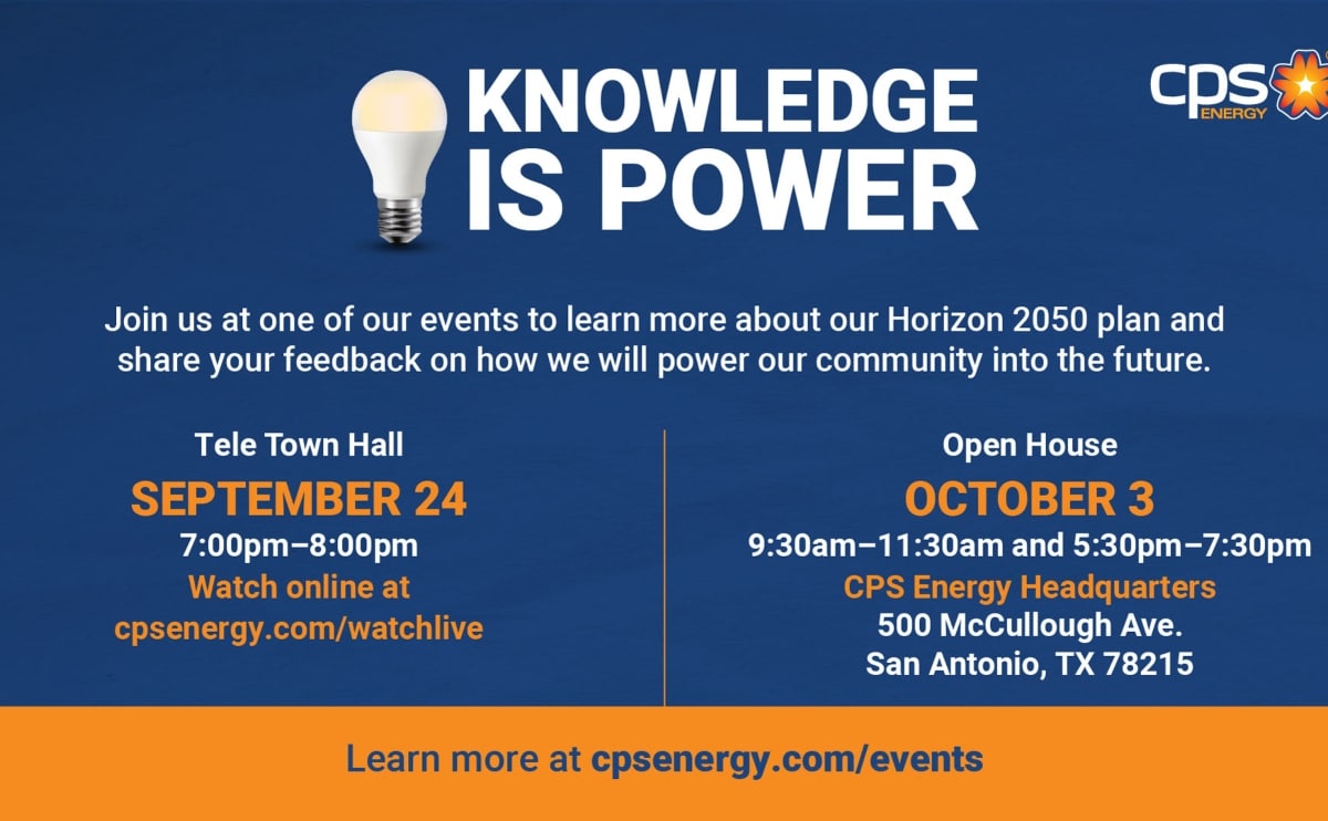 Join CPS Energy at one of their Open House events, "Knowledge is Power," to learn more about their "Horizon 2050 plan and share your feedback on how they will power the community into the future."