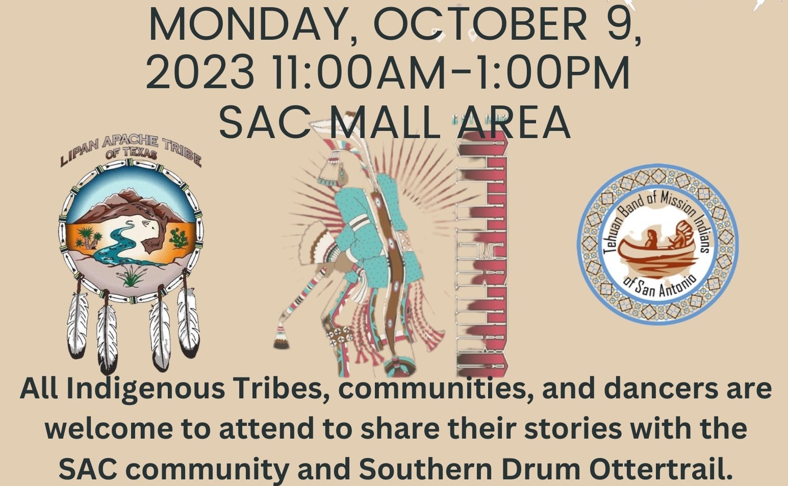 San Antonio College (SAC) Commemorates “Indigenous People’s Day. The event will be held in the “Sac Mall Area” on the back side of the Moody Learning Center. See you there!