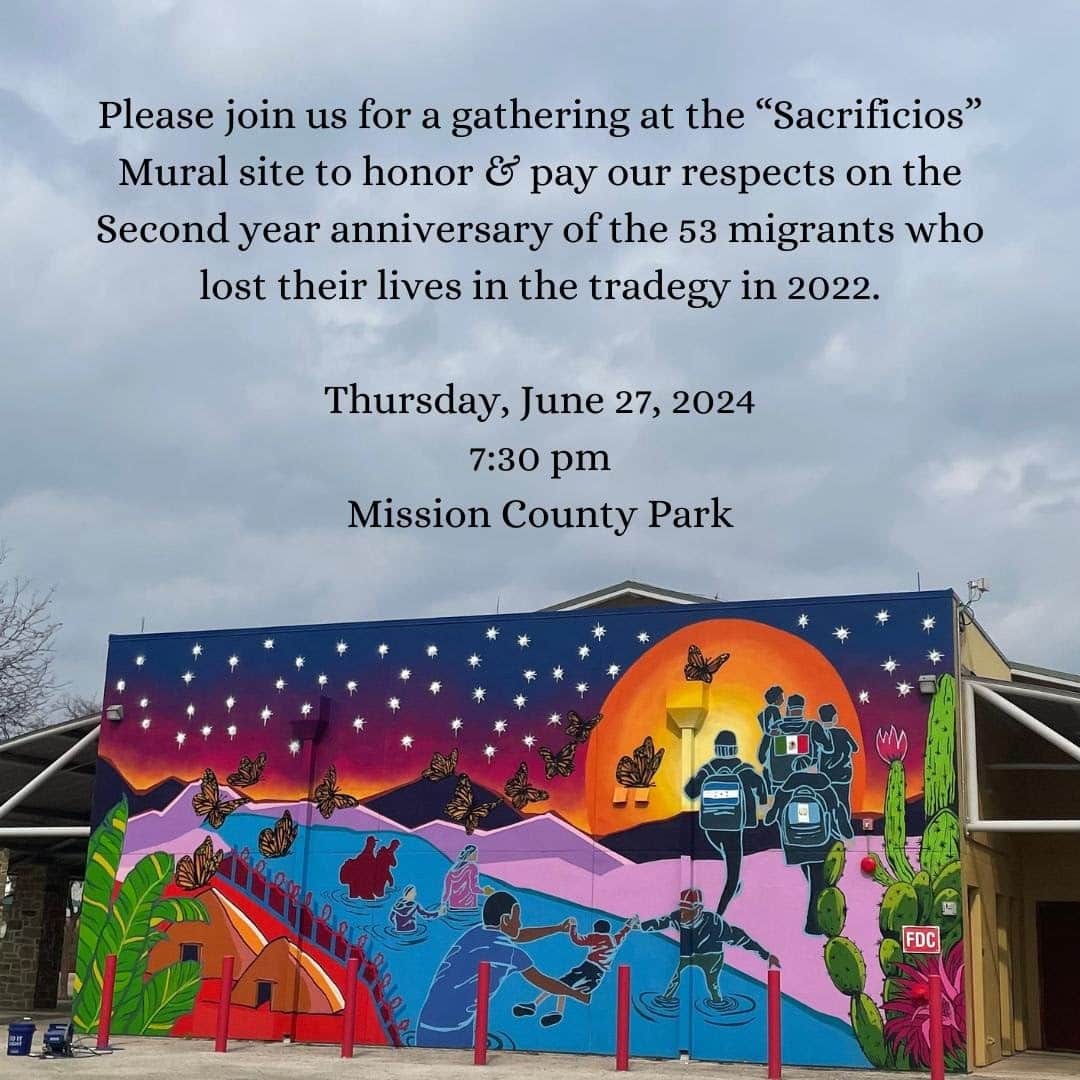 At 7:30PM on Thursday, there will be a community gathering at the “Sacrificios” Mural site at Mission County Park to honor and pay our respects on the second year anniversary of the 53 migrants who lost their lives in the tragedy in 2022. There will be a short blessing.