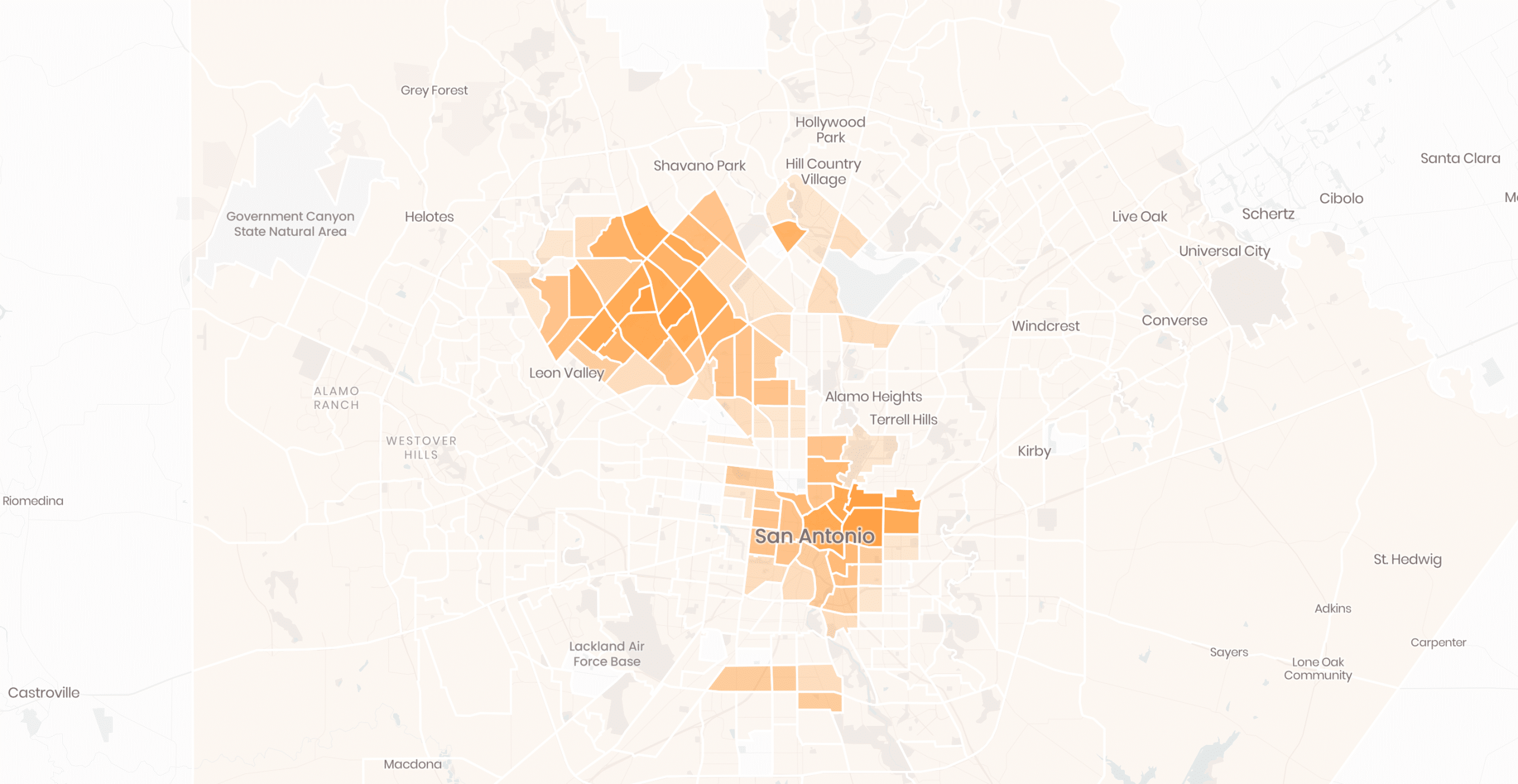 Deceleration mapped heat island impact for Bexar County by Census Tract in 2022. We found that more than half of the hottest Census tracts are in District 8 and District 1