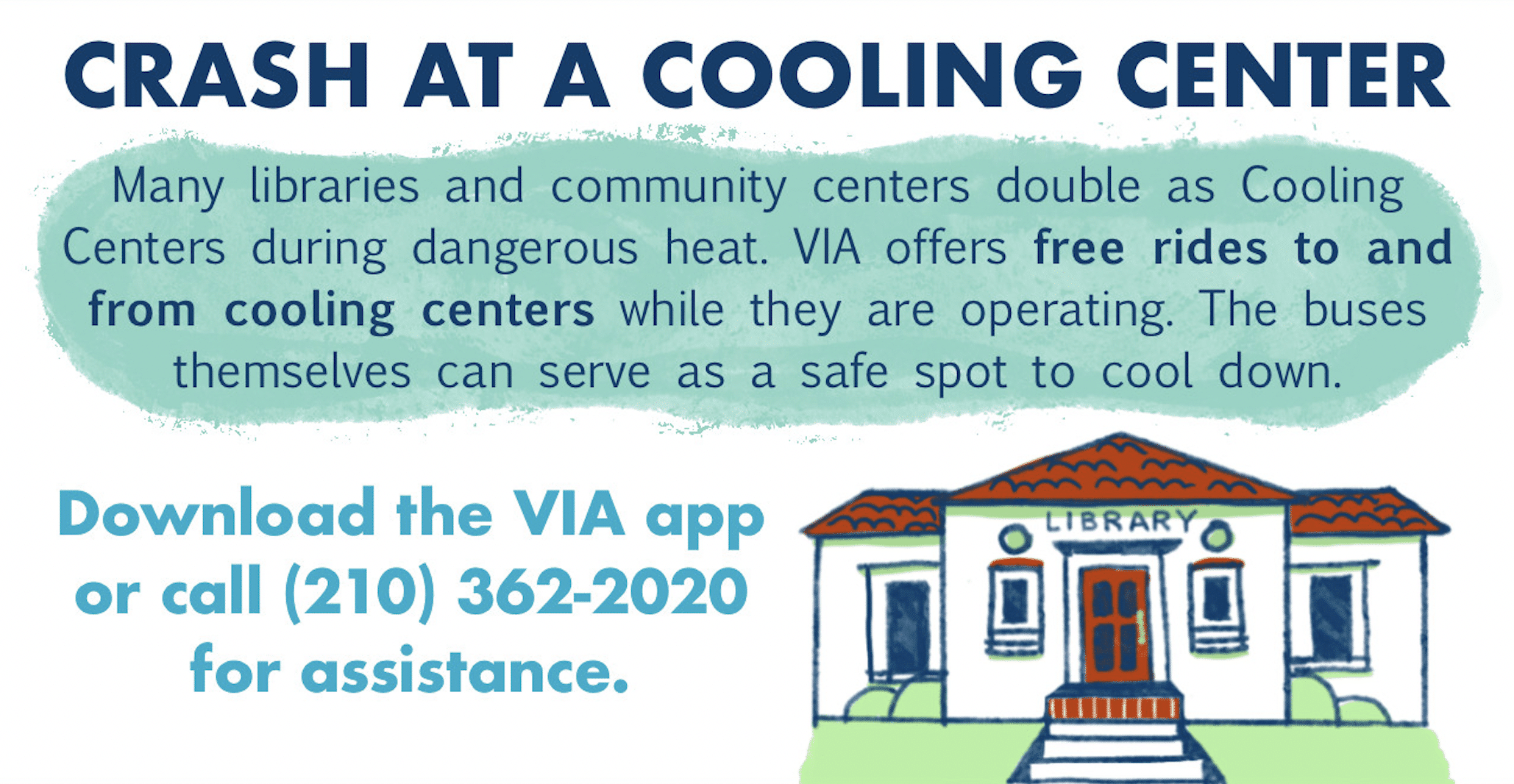 - Crash at a cooling center (locations) … Also see: VIA free bus rides.