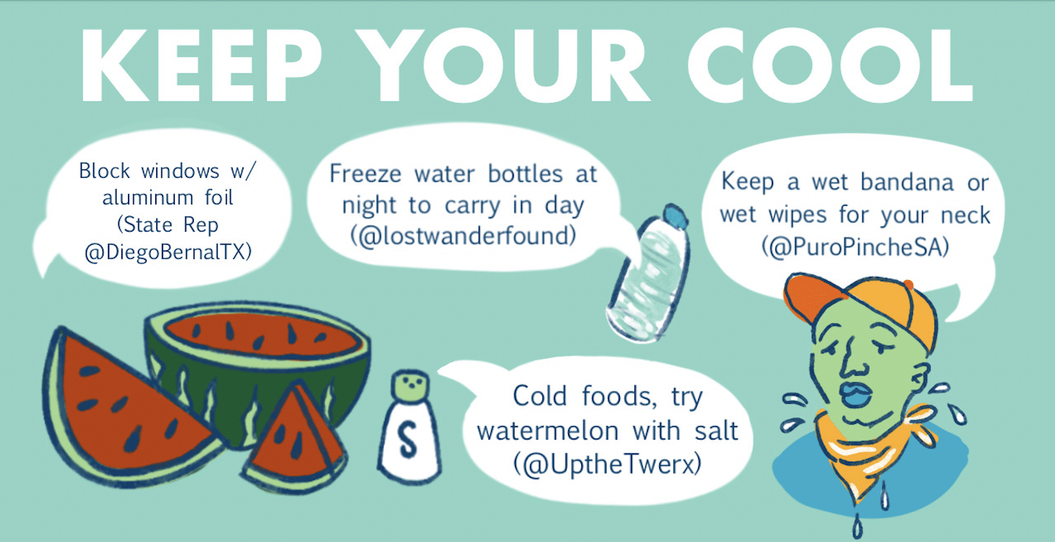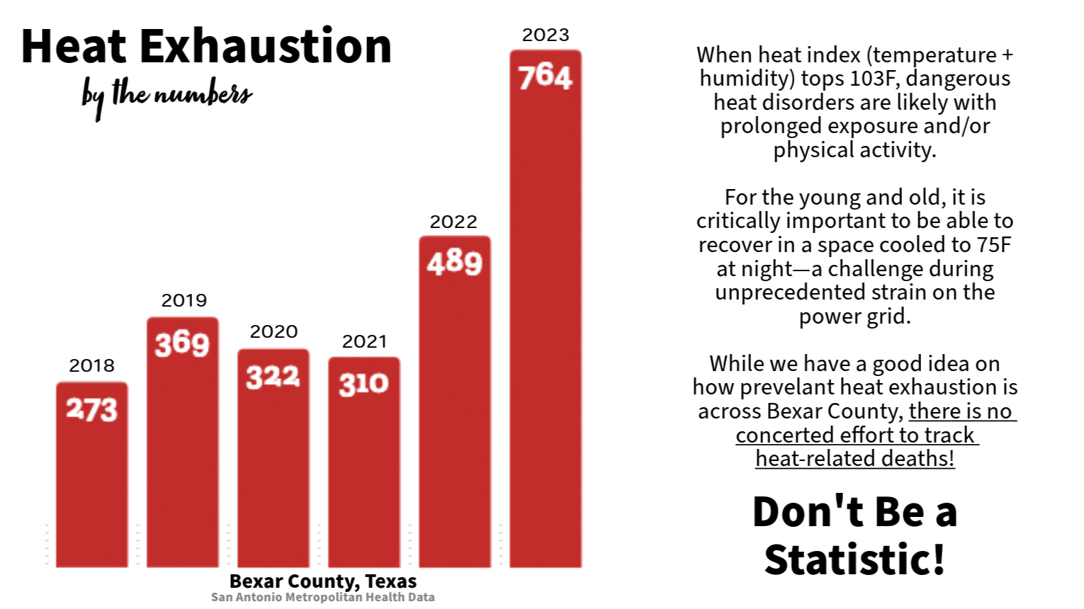 Deceleration organized this guide to help people stay healthy during the reality of rising heat. We had a lot of help from the community and consulted public health experts and reviewed existing local, state, and federal resources. Much of the info we received has been distilled and integrated into this page, which will be updated in the months and years ahead. The need for this information is clear, as captured in the (almost-certainly-an-undercount) record-breaking number of heat-illness cases collected by San Antonio’s Metropolitan Health District last summer. Yet the Bexar County Medical Examiner isn’t even counting the number of people dying from heat each year. You can sign the petition to demand this change now!