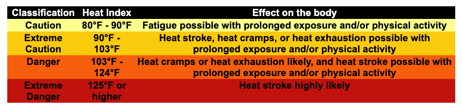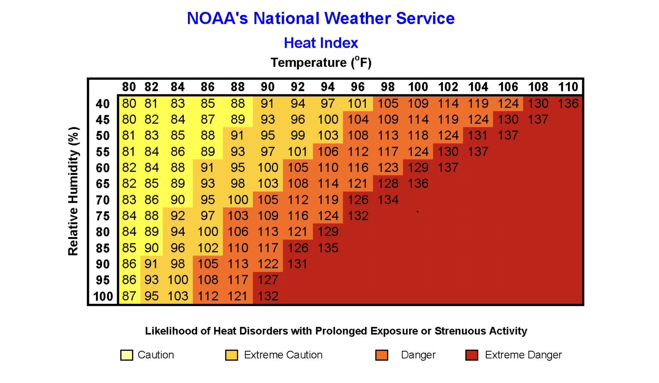 It’s the heat. And it’s the humidity. To understand the impact of heat on the human body, you have to understand how the body experiences heat. That is as a combination of air temperature (what meteorologists usually say) plus the relative humidity (something they may leave out). The may calcutate the two and relay the “feels like” temperature. At high heat index levels, the body loses the ability to cool itself down by perspiration, raising your risk of heat illness and heat stroke. To calculate your risk, you can use the chart below. Or you can use this online calculator. (NOTE: This chart is using shady locations. If you are in the sun, add another 15F.)