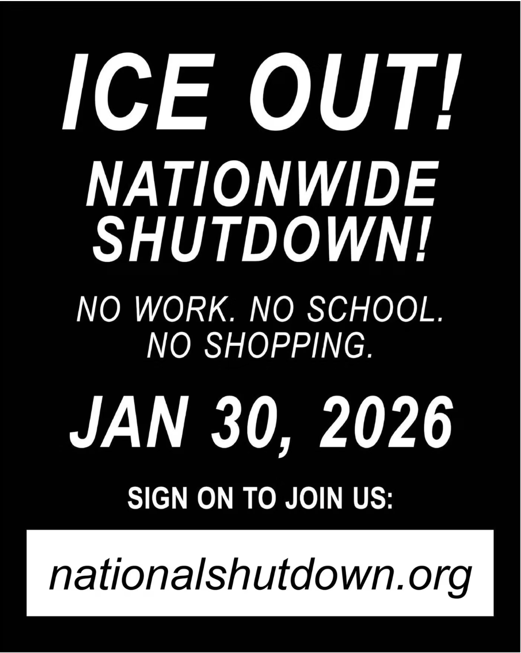 “The people of the Twin Cities have shown the way for the whole country—to stop ICE’s reign of terror, we need to SHUT IT DOWN,” organizers said. “On Friday, January 30, join a nationwide day of no school, no work, and no shopping.”