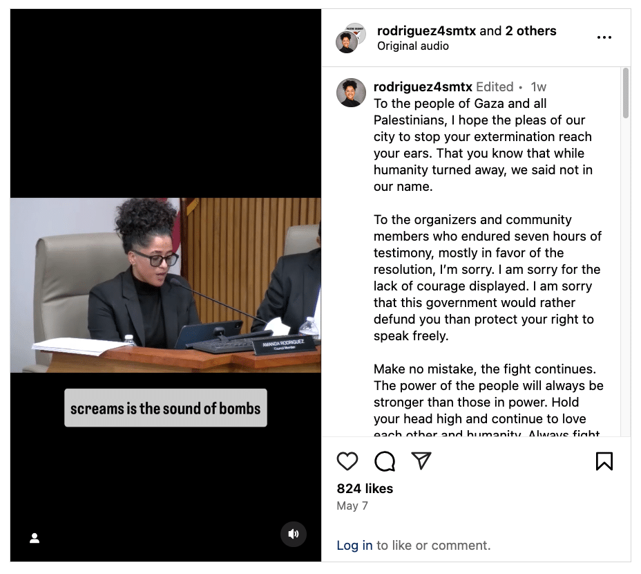 Palestine Solidarity SMTX first began petitioning the city council for a ceasefire resolution in 2024. To reach a formal vote in front of the full city council, the resolution required either the support of the mayor, or two sponsors from among the other seats on the council. Although Alyssa Garza, the Place 3 councilmember, was an early supporter, it failed to find that second sponsor. So Palestine Solidarity SMTX ran a candidate of their own in the 2024 election: Amanda Rodriguez, an experienced community organizer and lifelong San Marcos resident.