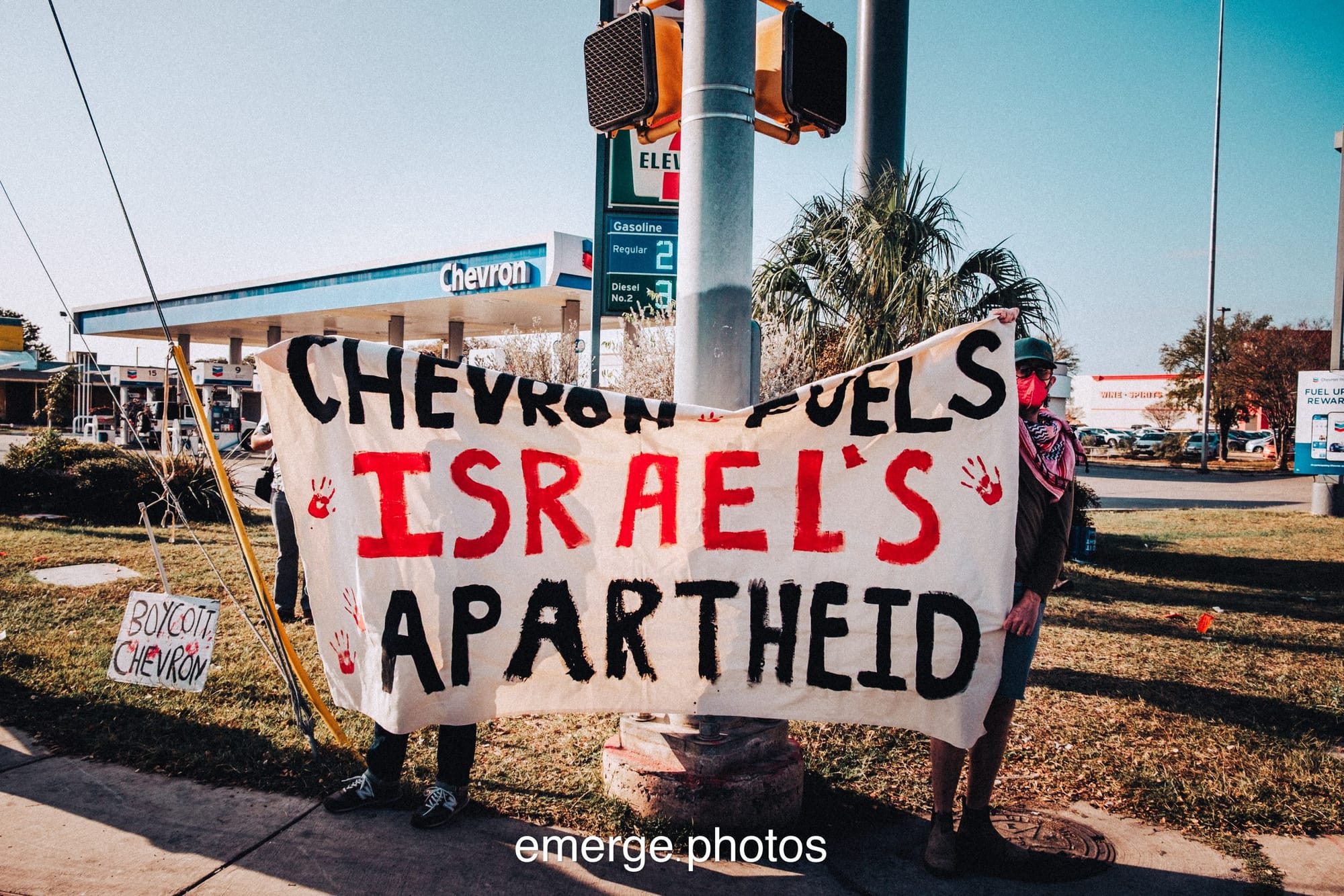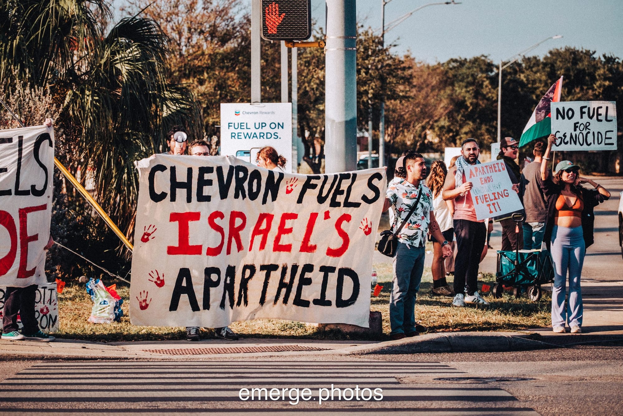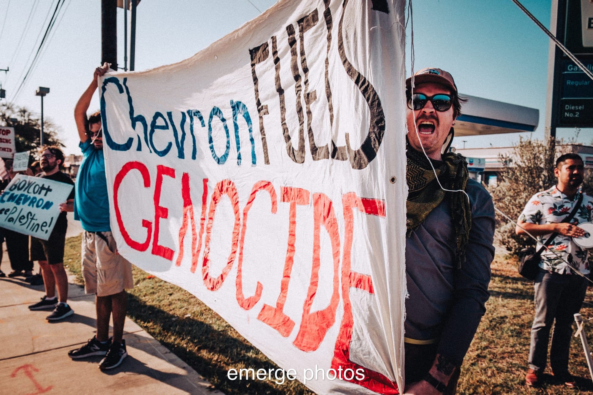 The Chevron station picket in San Antonio marks the beginning of a broader US campaign to step up pressure on the company, which recently moved operations from California to Houston (“the policies [in Texas] are welcoming of energy companies,” Chevron executive Mike Wirth said). In addition to asking drivers directly to boycott Chevron and to communicate this decision to CEO Wirth, Stop Fueling Genocide is also talking to the franchise owners of San Antonio’s 57 Chevron-branded filling stations, asking them to sign onto a national petition urging Chevron to divest from its business ties to Israel.