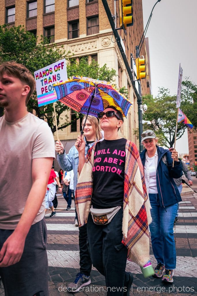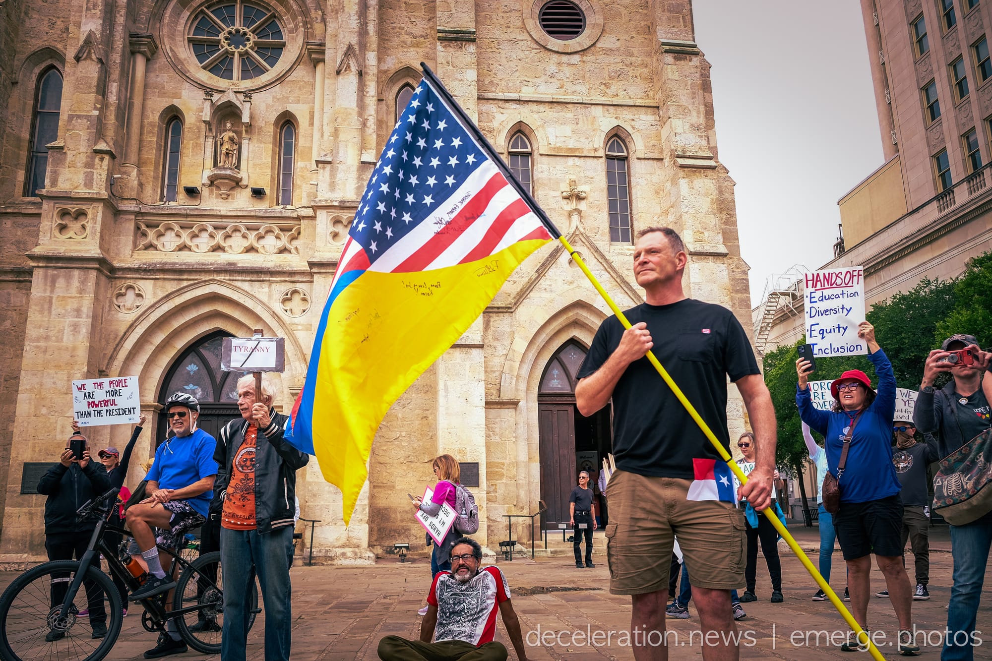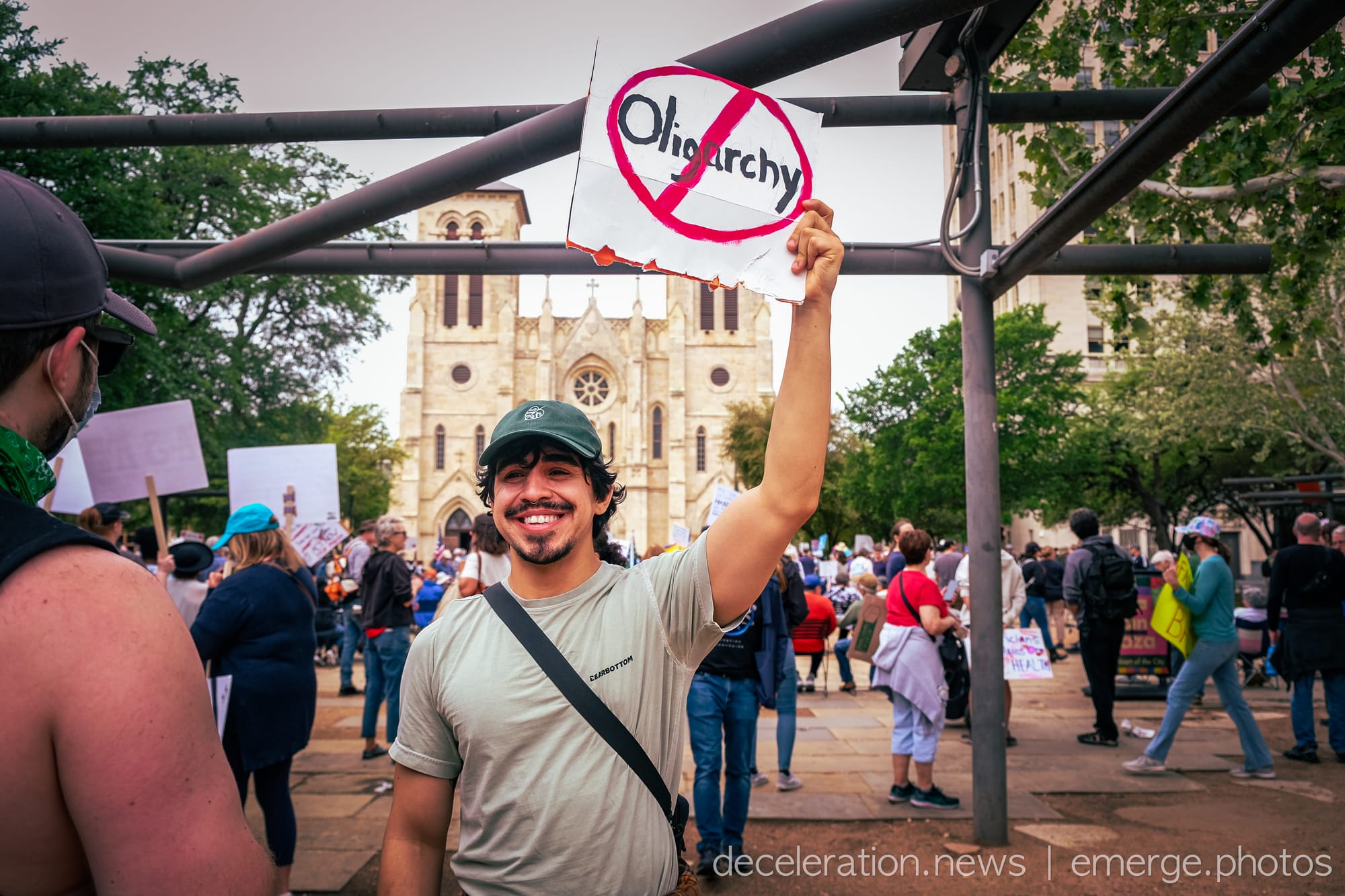 Thousands of San Antonio area residents congregated under the bell towers of San Fernando Cathedral at Main Plaza and marched across downtown on Saturday, April 5, 2025, to decry threats to democracy under President Trump and his unofficial but omnipresent adjunct Elon Musk.