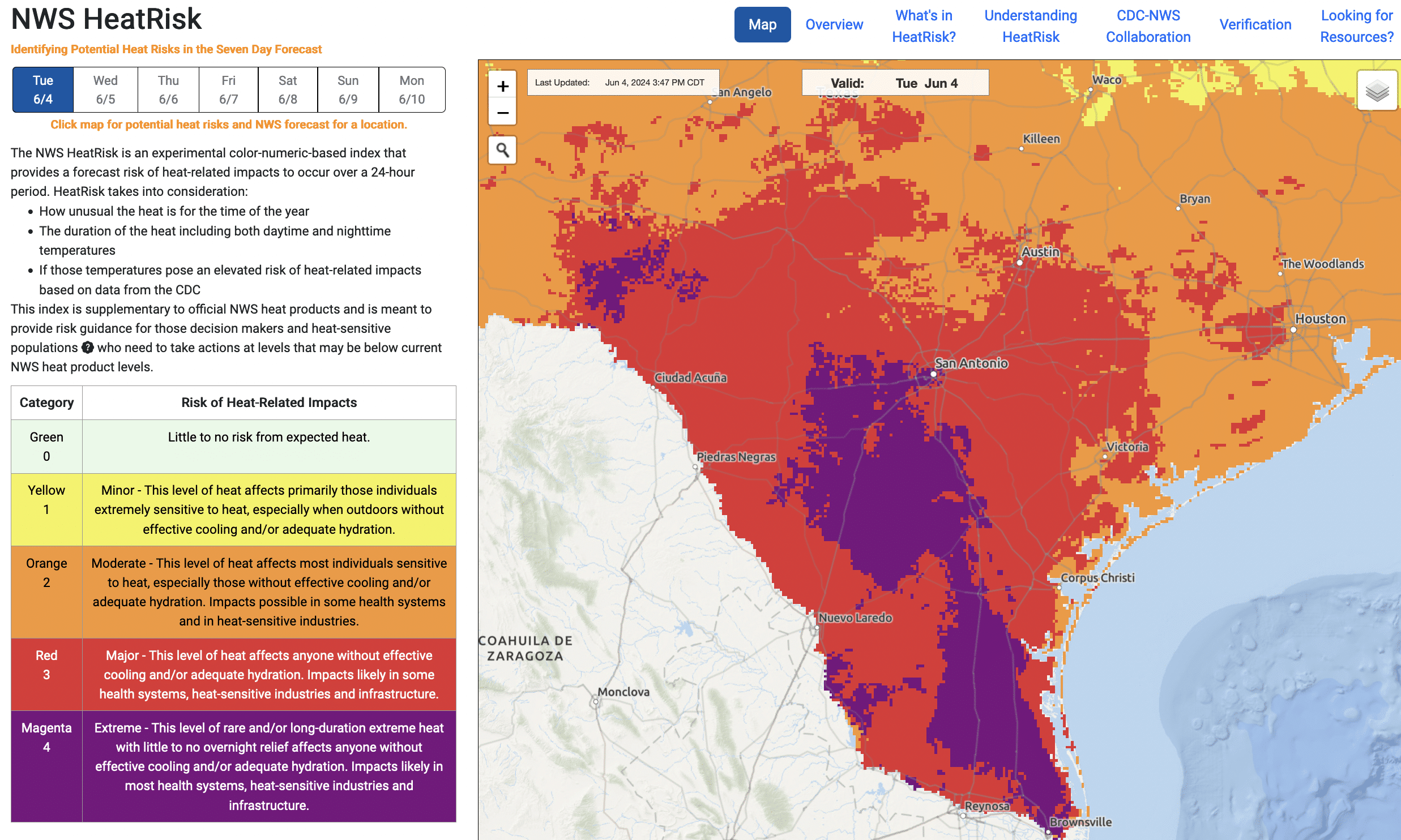 Extreme heat risk signifies rare, multi-day periods of extremely high heat that is “very dangerous to anyone without proper hydration or adequate cooling.” All people exposed to this heat are considered at risk and conditions can turn deadly for anyone without artificial cooling. Fans are no longer effective once the heat index climbs into the upper 90s and can actually exacerbate heat-illness symptoms.