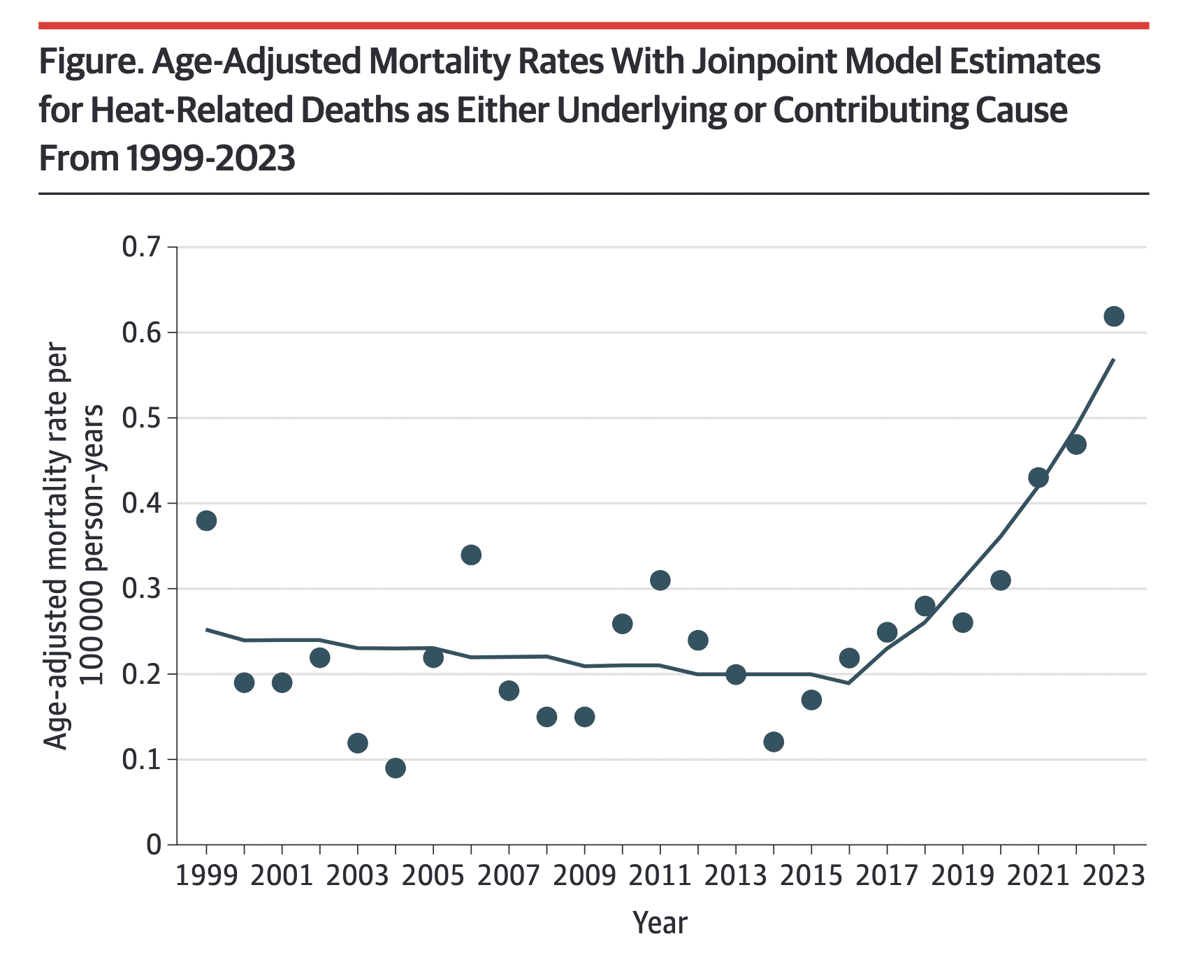 A Research Letter published late last month in the Journal of American Medical Association (and kindly passed to Deceleration from a contributing writer at Yale Climate Connections) found that annual heat-related deaths in the United States rose from 1,069 in 1999 to 2,325 in 2023—a 117 percent increase. The rise has been the most dramatic since 2020. The team, including a lead author based at University of Texas at San Antonio, concludes that it is also a trend unlikely to subside any time soon.