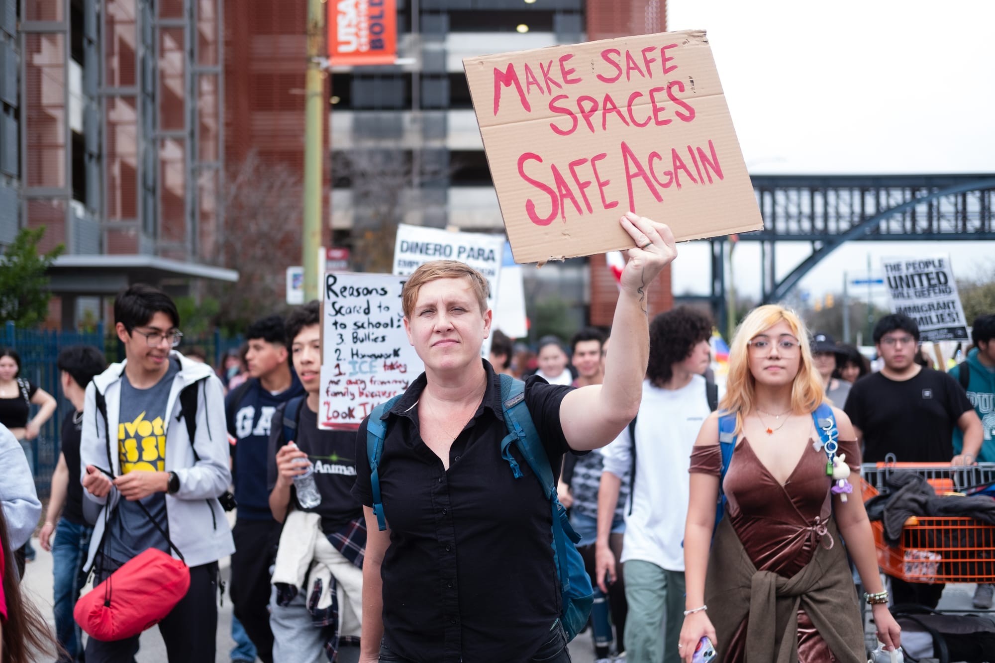 Hundreds of students from multiple downtown-area San Antonio campuses walked out of classes around 1p.m. on Wednesday, Feb. 5, 2025, as part of an “open protest,” a stand “for justice, for humanity, for the future we deserve.” They gathered first at Yanaguana Gardens at Hemisfair Park before taking over city streets on a march to San Antonio’s City Hall, where several elected leaders stood in solidarity for a time before returning to a scheduled meeting indoors.
