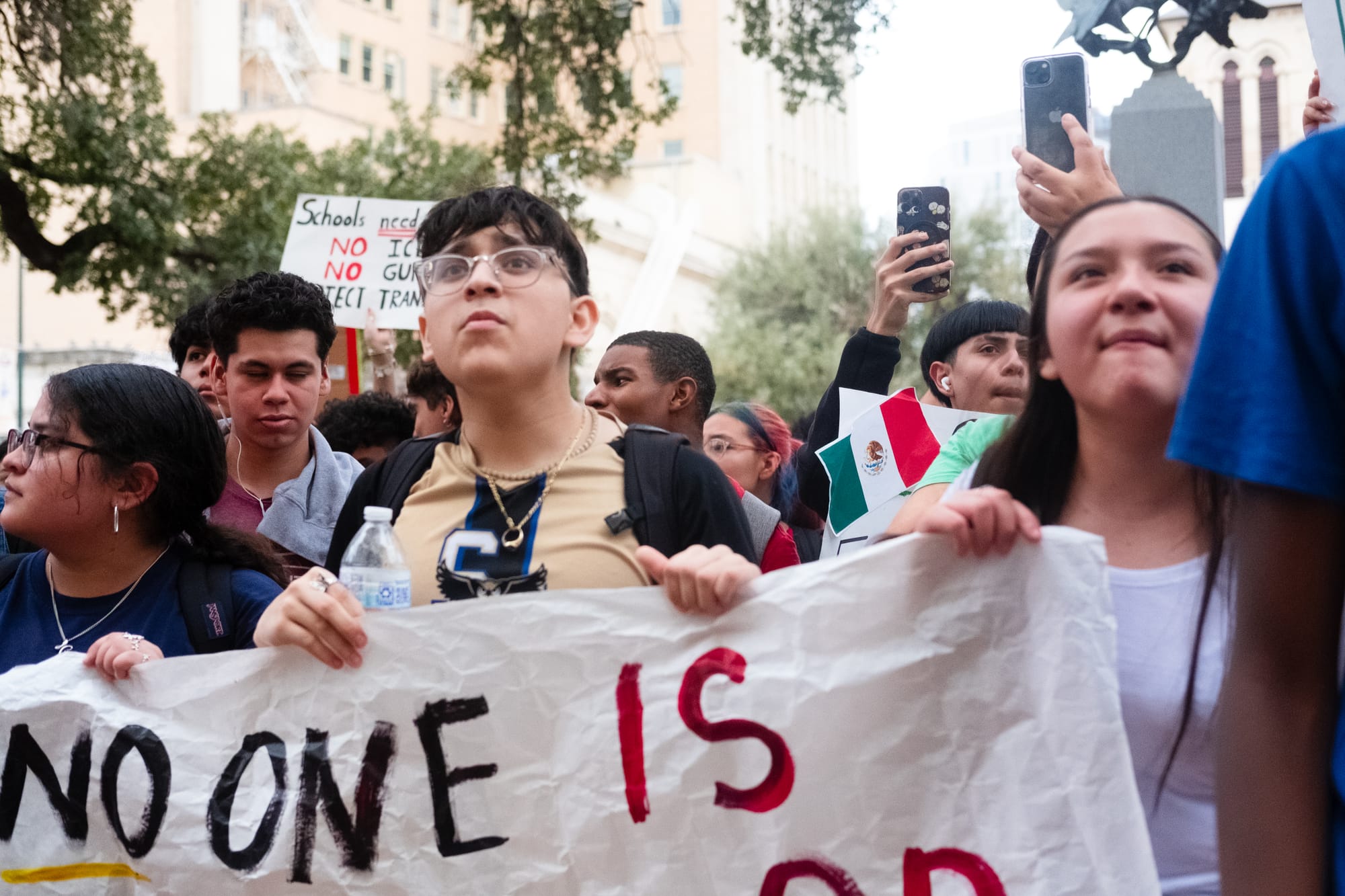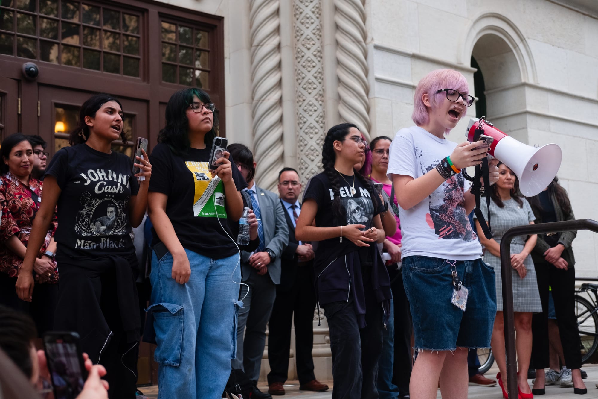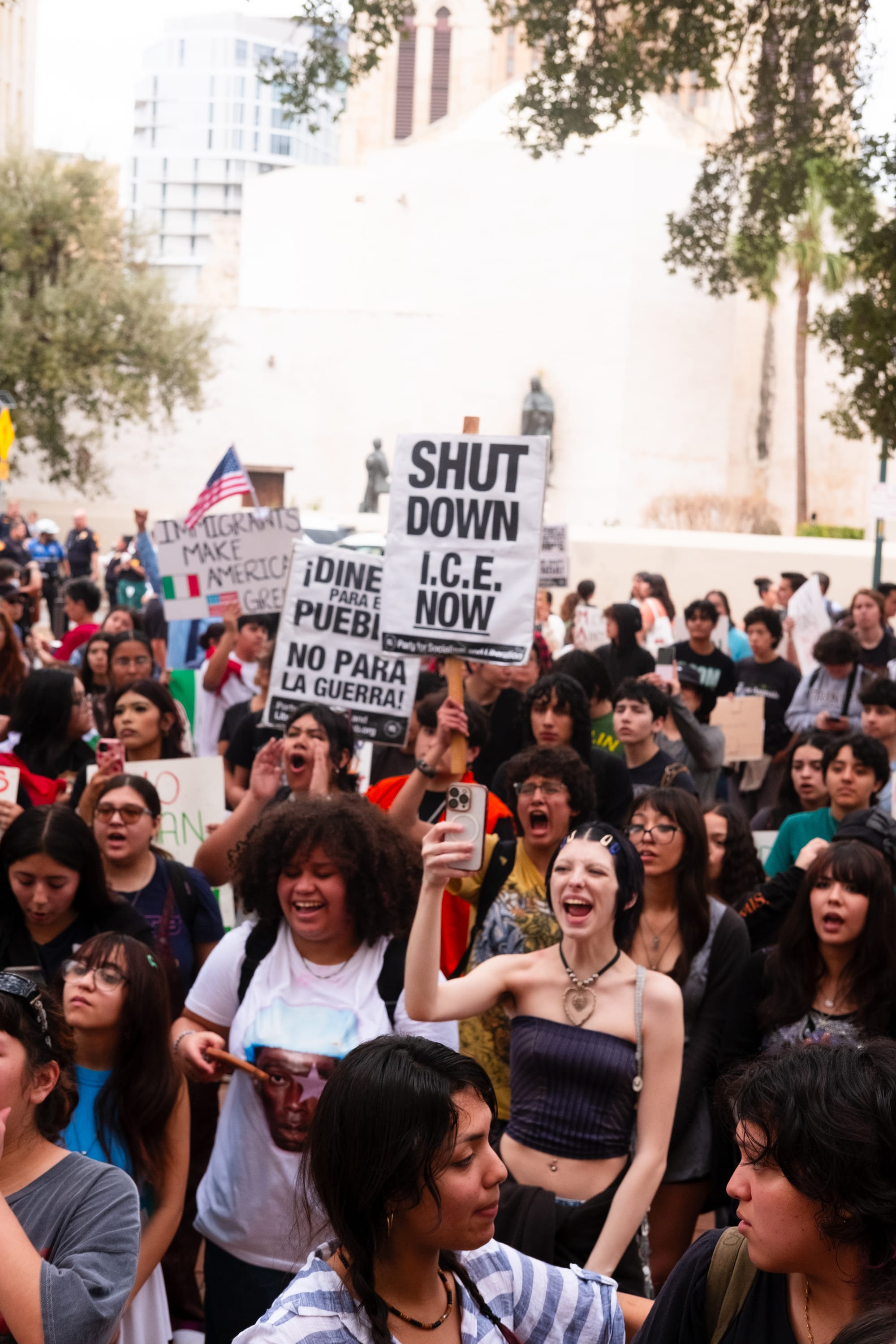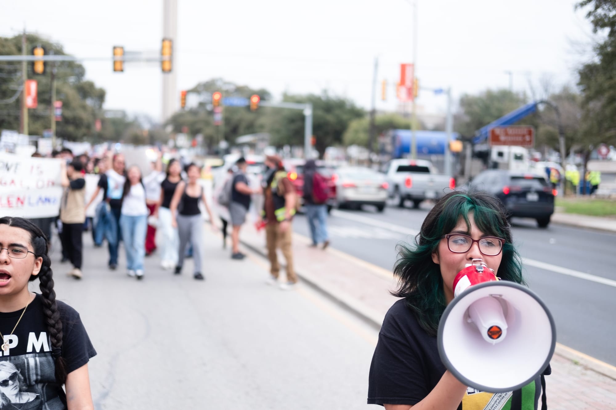 Hundreds of students from multiple downtown-area San Antonio campuses walked out of classes around 1p.m. on Wednesday, Feb. 5, 2025, as part of an “open protest,” a stand “for justice, for humanity, for the future we deserve.” They gathered first at Yanaguana Gardens at Hemisfair Park before taking over city streets on a march to San Antonio’s City Hall, where several elected leaders stood in solidarity for a time before returning to a scheduled meeting indoors.