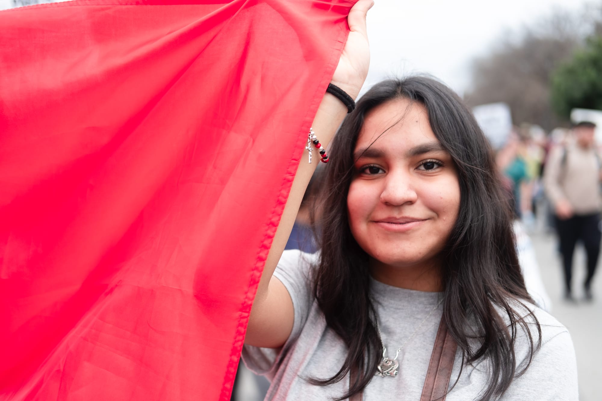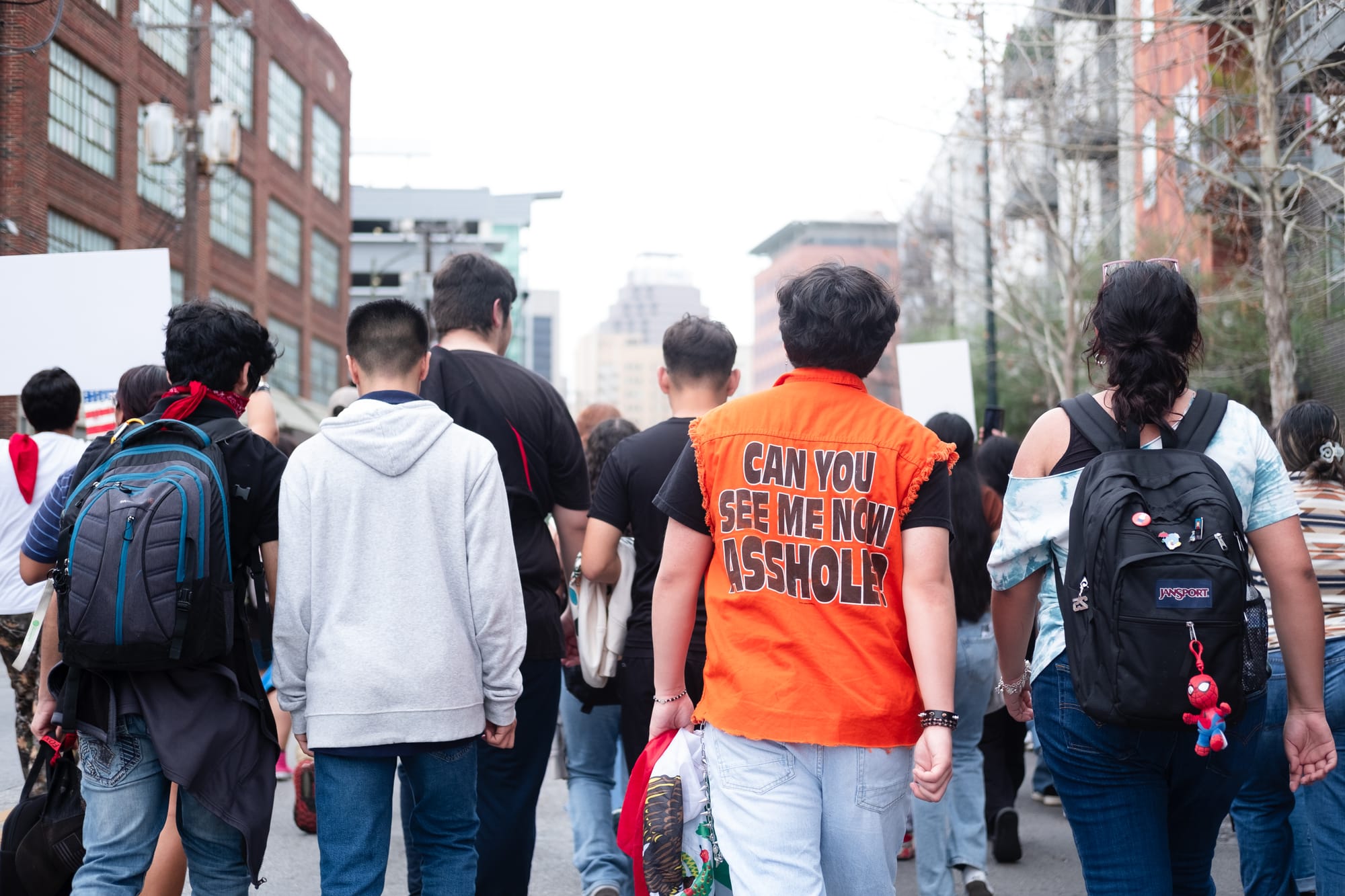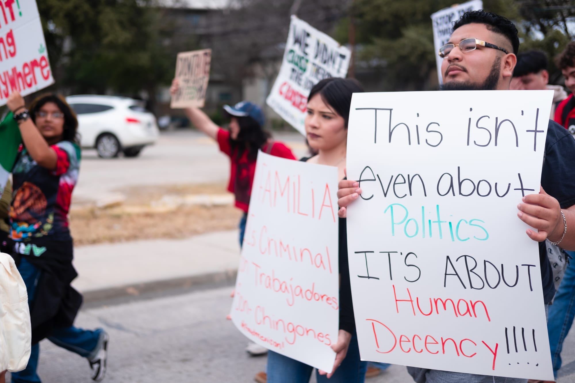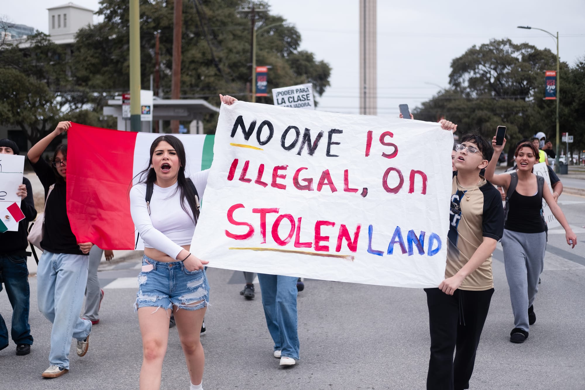 Hundreds of students from multiple downtown-area San Antonio campuses walked out of classes around 1p.m. on Wednesday, Feb. 5, 2025, as part of an “open protest,” a stand “for justice, for humanity, for the future we deserve.” They gathered first at Yanaguana Gardens at Hemisfair Park before taking over city streets on a march to San Antonio’s City Hall, where several elected leaders stood in solidarity for a time before returning to a scheduled meeting indoors.