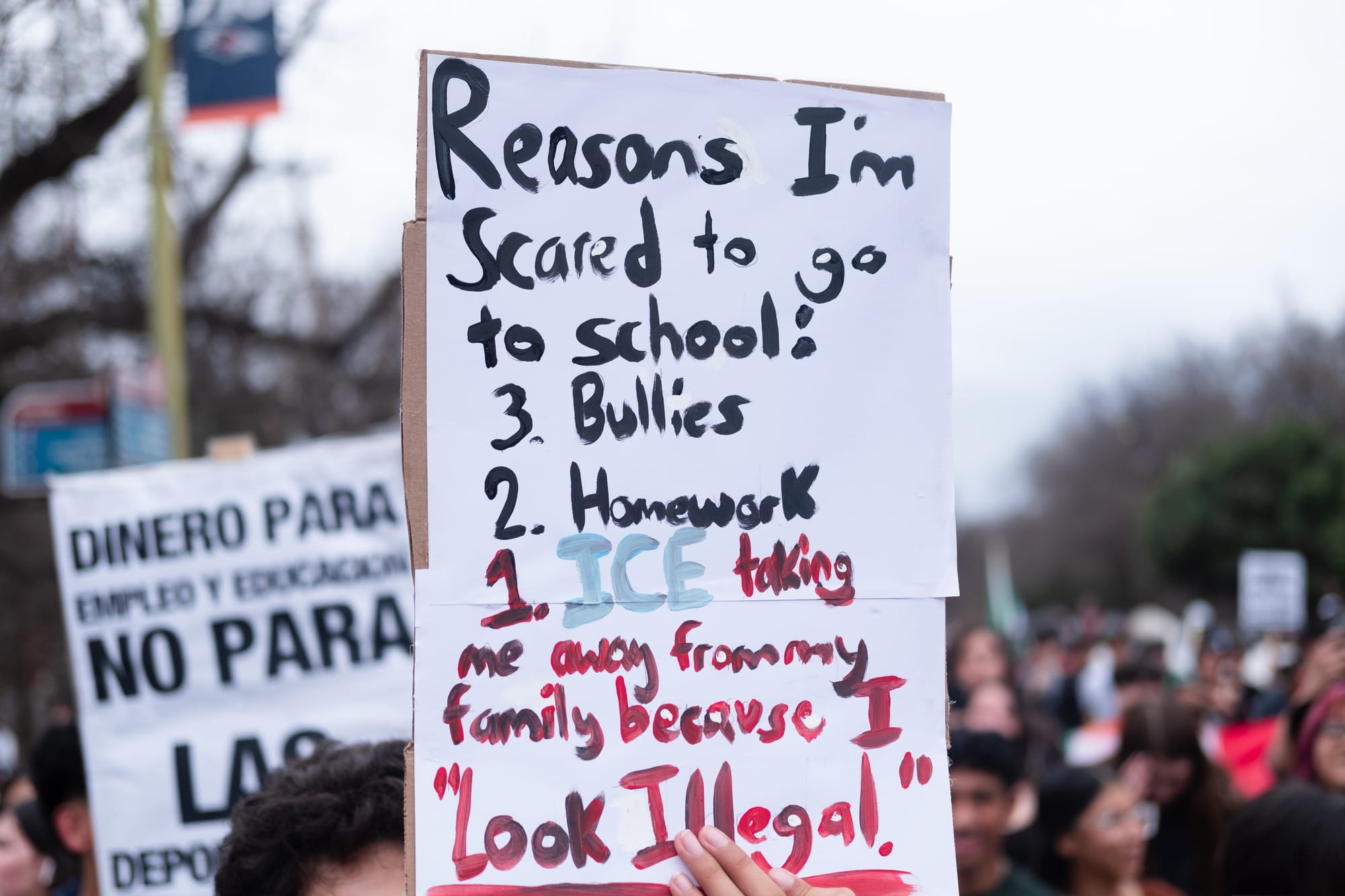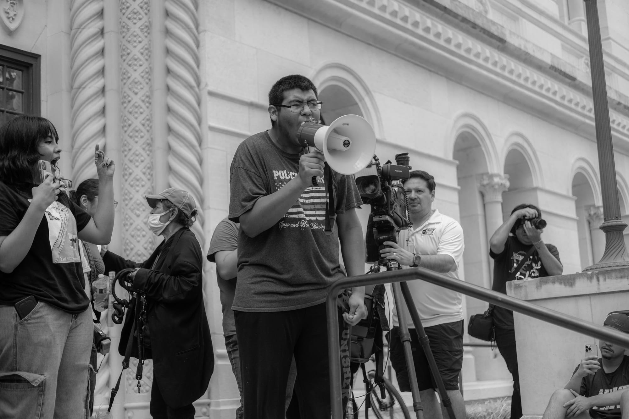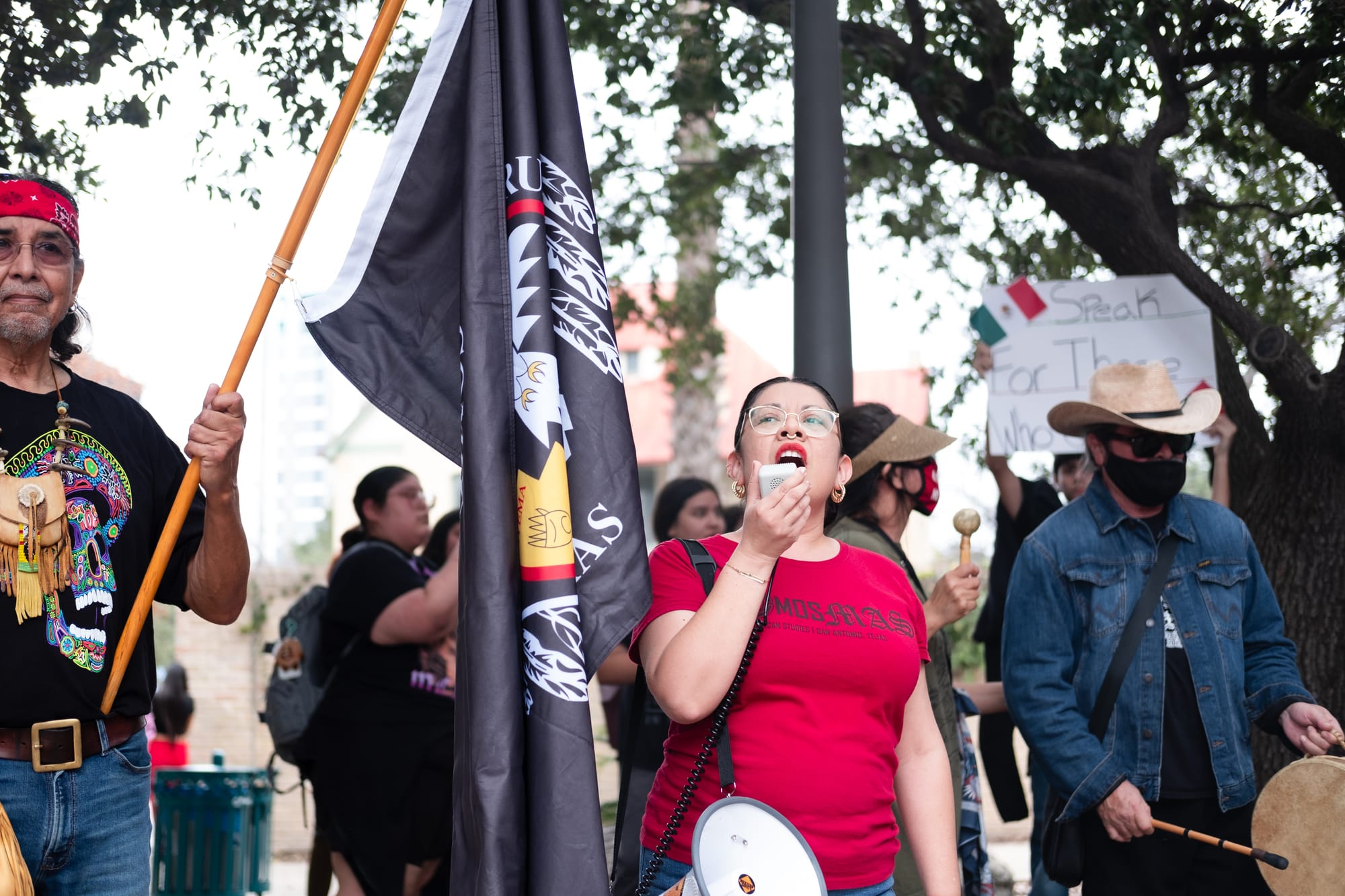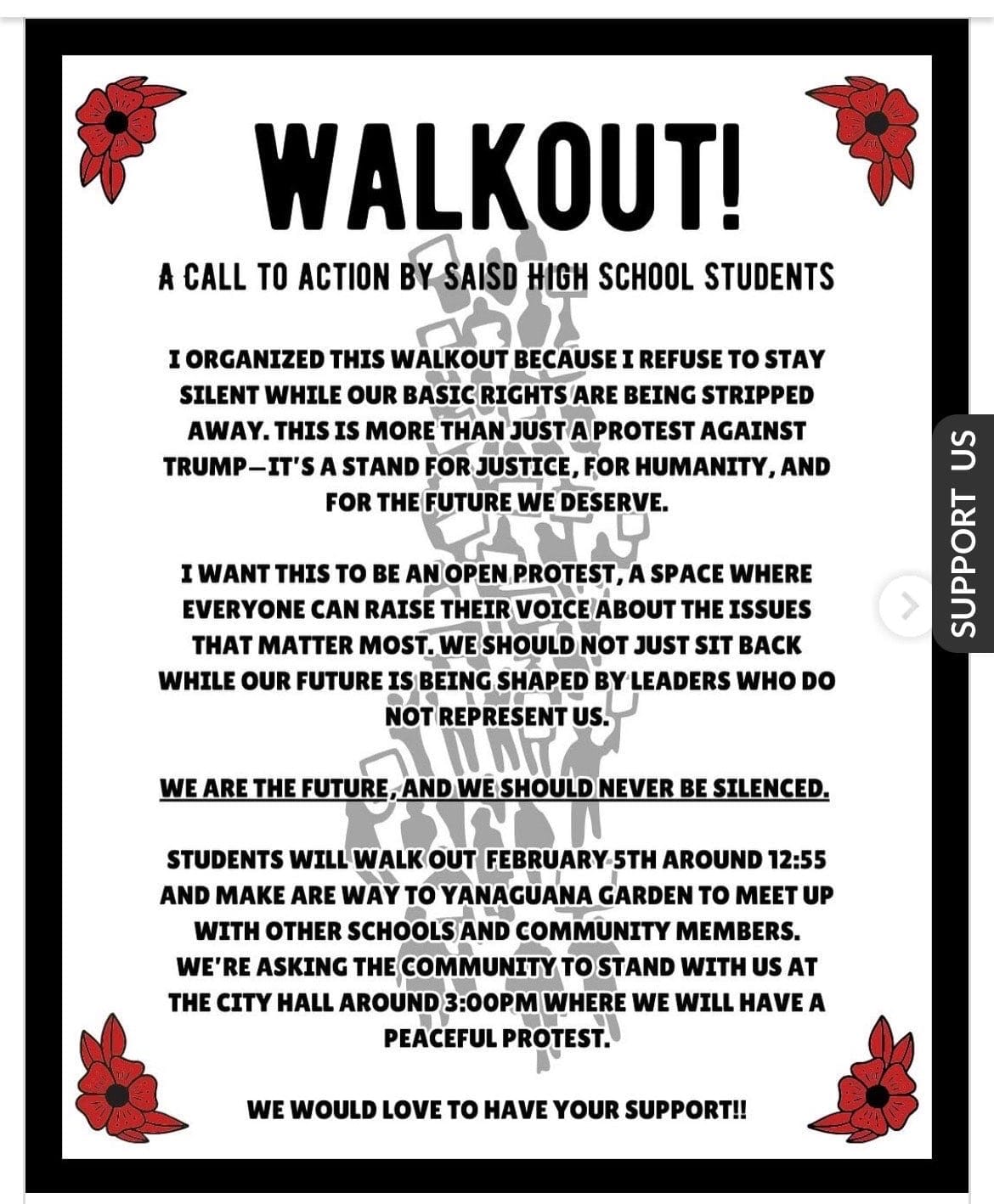 Hundreds of students from multiple downtown-area San Antonio campuses walked out of classes around 1p.m. on Wednesday, Feb. 5, 2025, as part of an “open protest,” a stand “for justice, for humanity, for the future we deserve.” They gathered first at Yanaguana Gardens at Hemisfair Park before taking over city streets on a march to San Antonio’s City Hall, where several elected leaders stood in solidarity for a time before returning to a scheduled meeting indoors.