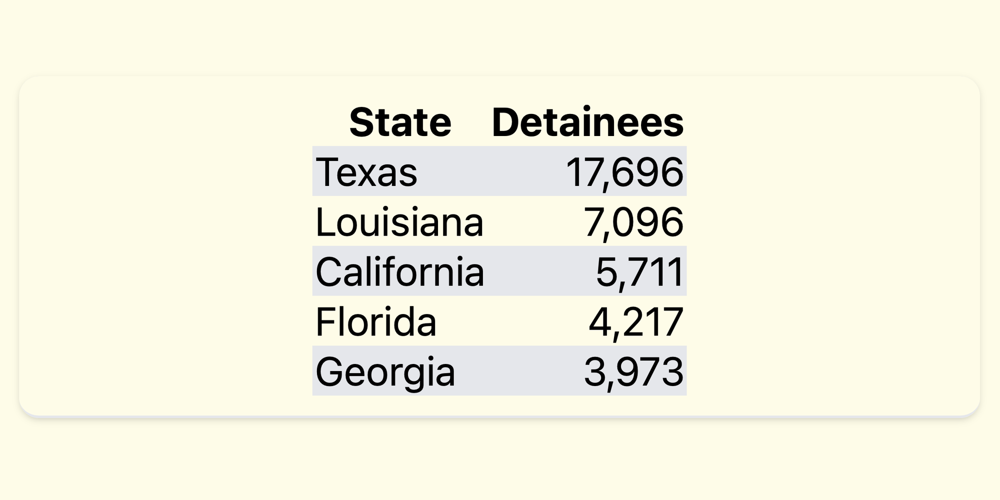 Texas, due to its geography and prominent deportation-industrial history housed the most people in detention, according to recent data.