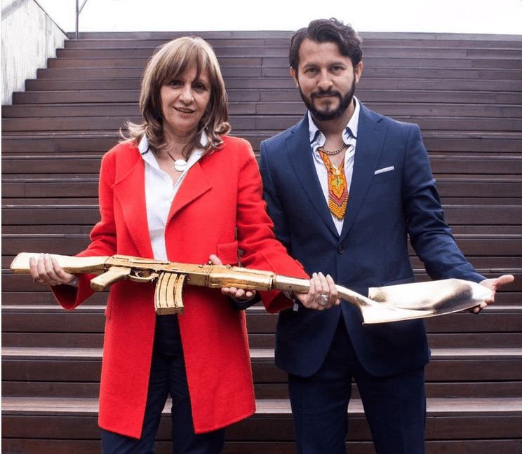 In the celebration of the collection of more than 7,100 weapons since the peace deal was signed by the Colombian government and leaders of the Revolutionary Armed Forces of Colombia, or FARC, last winter. In this golden sculpture, long-denied dreams of peace have converted a ubiquitous tool of war into a vehicle for peace and prosperity.