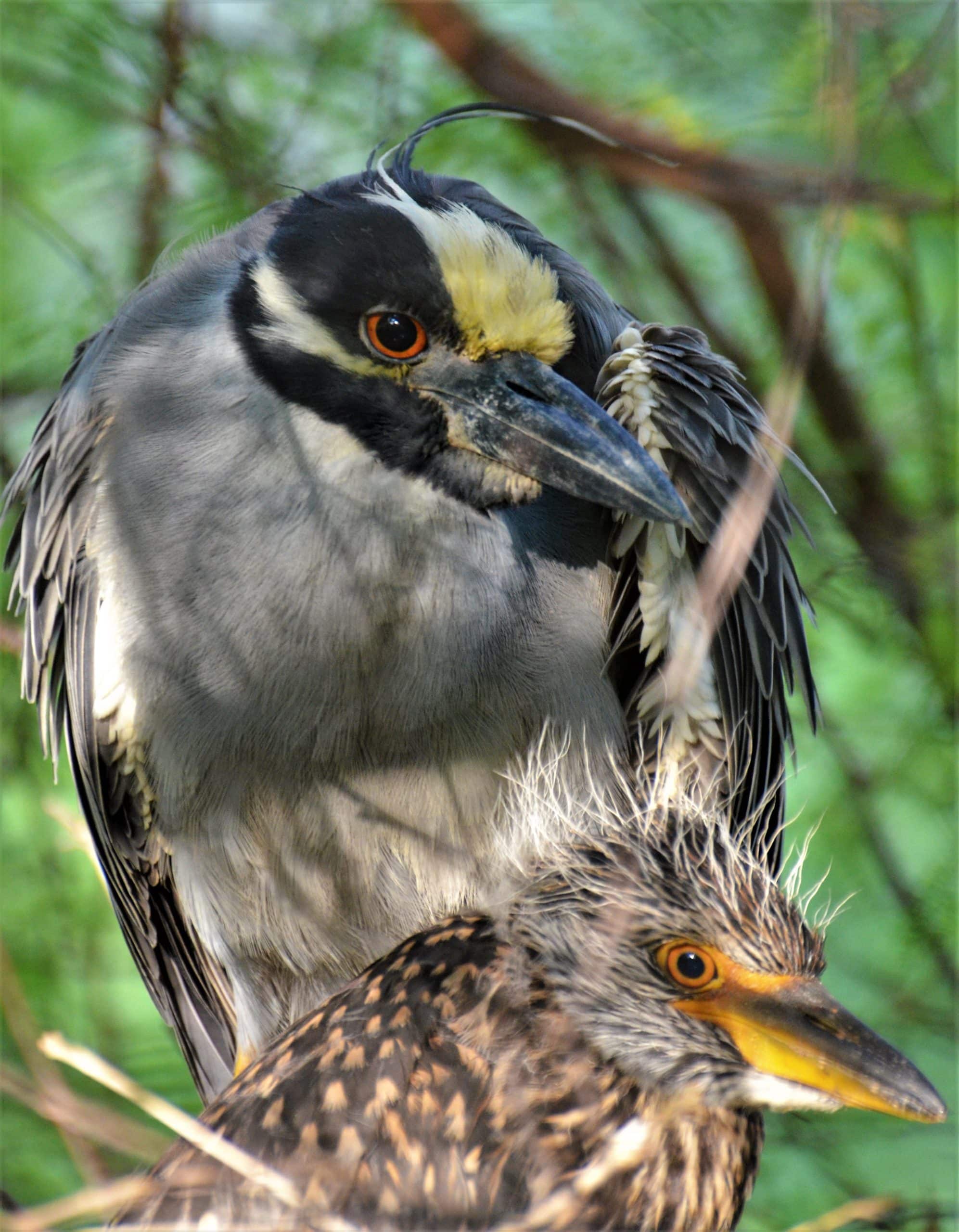 As a citizen scientist, Garlock collects data on the Yellow Crowned Night Heron for an A&M professor—a process that commits her to documenting the mating, nesting, and hatching process from start to finish, counting the number of nests and birds she sees in a given year. In 2018, for instance, she counted 22 nests for the Great White Egret, generally the first to begin nesting. Once endangered by the plume trade, the Snowy Egret last year had around 50 nests here, as did the Little Blue Heron. The Tricolored Heron, considered climate endangered by the Audubon Society, had only eight nests, five of which were lost to predators, leaving only eight chicks for the year.