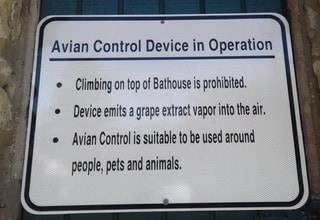 The active component of Avian Control is a substance called Methyl Anthranilate (MA), a food-grade flavoring agent with a purpley grape odor. It’s also used as a bird irritant, targeting the trigeminal nerve system and causing discomfort, stress, and disorientation. While warning signs placed by the City identify Avian Control as a “grape extract vapor,” MA is derived not from grapes but by heating two chemicals—anthranilic acid and methanol—in the presence of hydrochloric acid.