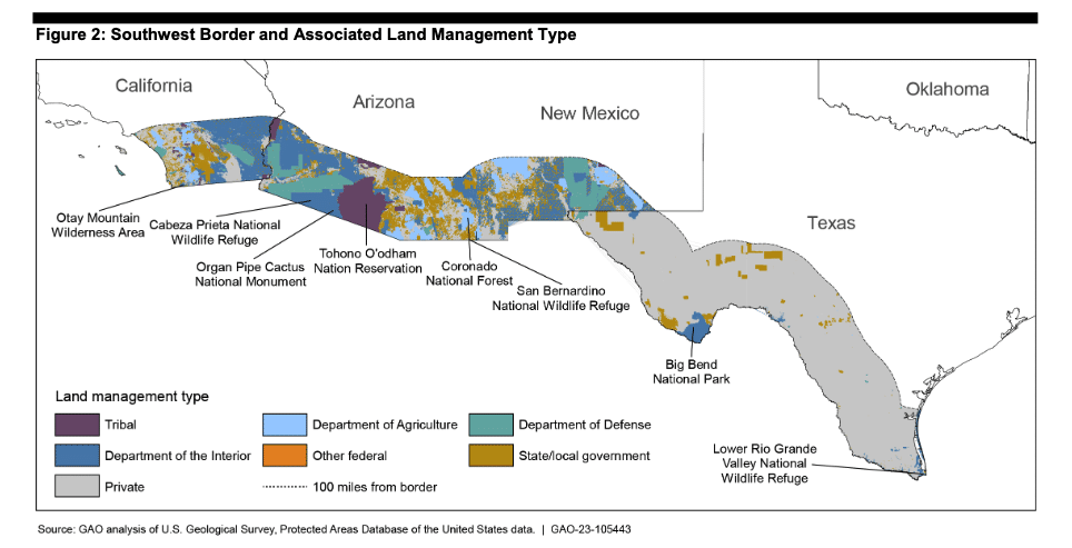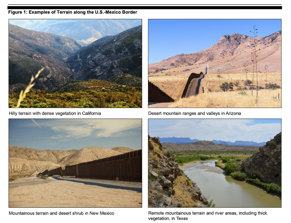 Due to steep topography, portions of the border remain open in Arizona and New Mexico, but that could change if Trump proceeds as planned. As of 2023, 741 miles of the entire 1,950-mile border (38 percent) was fenced, per a U.S. General Accountability Office (GAO) report. During his first term, Trump extended the border wall by 87 miles at a cost of $15 billion; this included replacing 282 miles of vehicle barrier—short enough to allow animals and pedestrians—with 18- to 30-foot metal bollards. The largely unfenced Texas border follows the Rio Grande River.