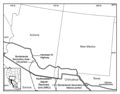 A 2021 study found that the 20 million acres of montane forests north of Interstate 10 in both New Mexico and Arizona could support a breeding population of 69 to 100 jaguars. However, even without a completed border wall, the six-lane I-10 freeway—plus inhospitable habitat, including commercial development and ranchlands with little protective cover—create barriers preventing jaguars from reaching and recolonizing the northern habitat on their own.