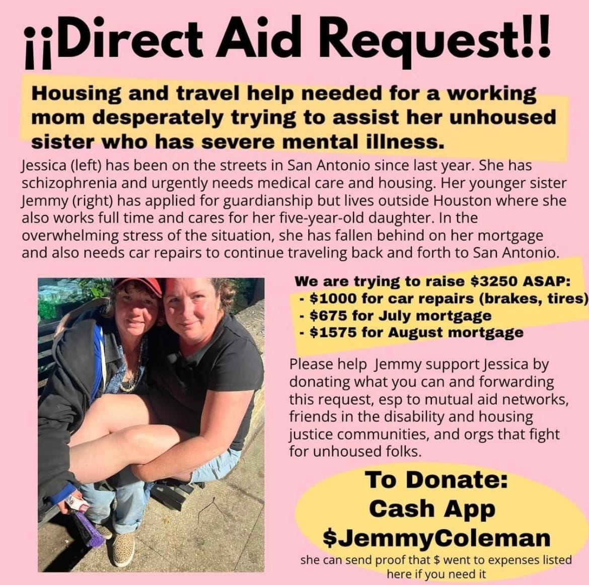 So I reached out to Jemmy. As with Albert, we started the process of applying for the Bexar County guardianship program that had saved Albert’s life for a time. I reached out to constituent services for District 5, where the jail was located, and later District 1, where Jessica hung out after release from jail, to request a meeting to discuss an emergency plan of action for connecting Jessica to resources and services. I reached out to mutual aid groups in the hopes street medics could establish regular check-ins with Jessica until guardianship came through. I tried connecting Jemmy with NAMI family support groups. We put together a direct aid request to raise funds.