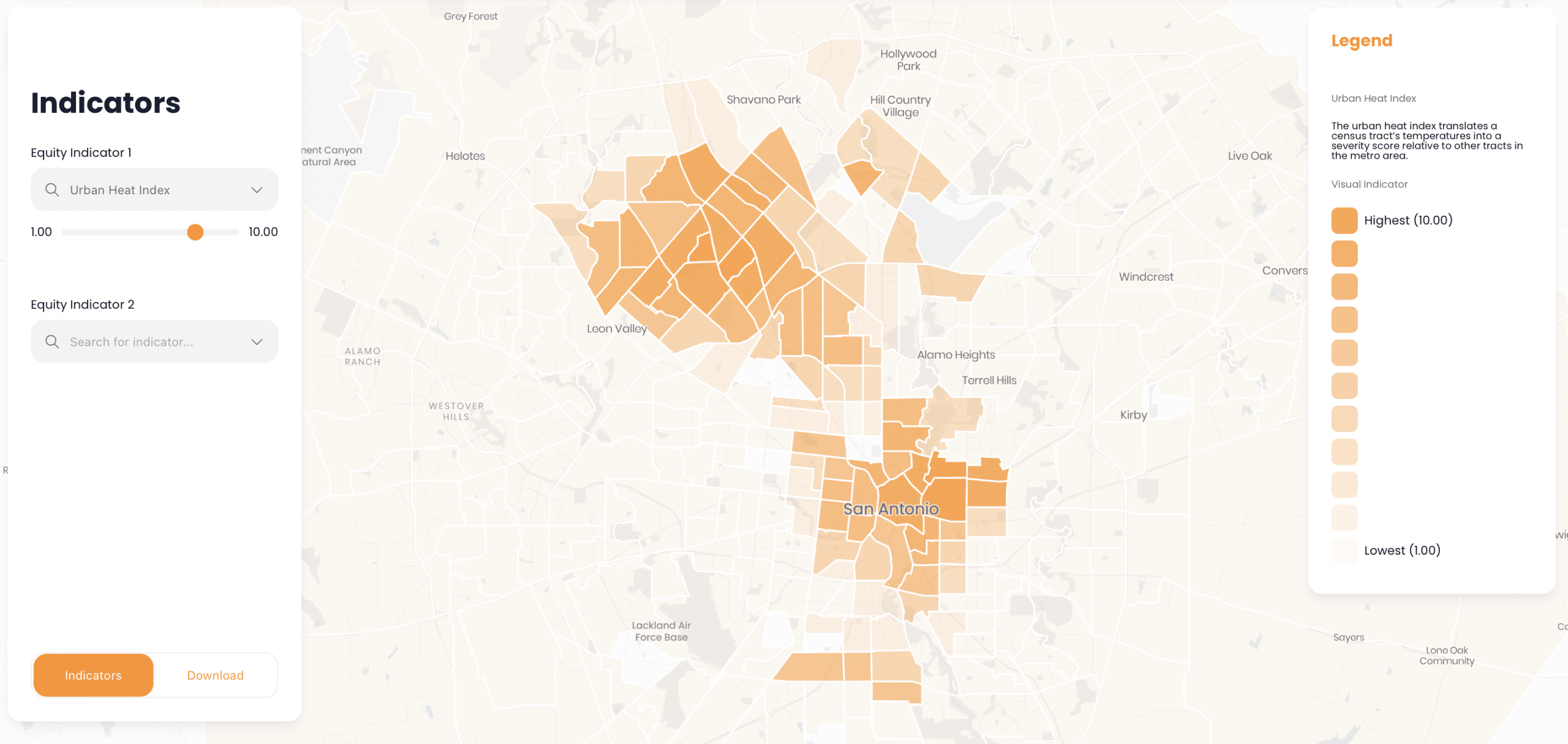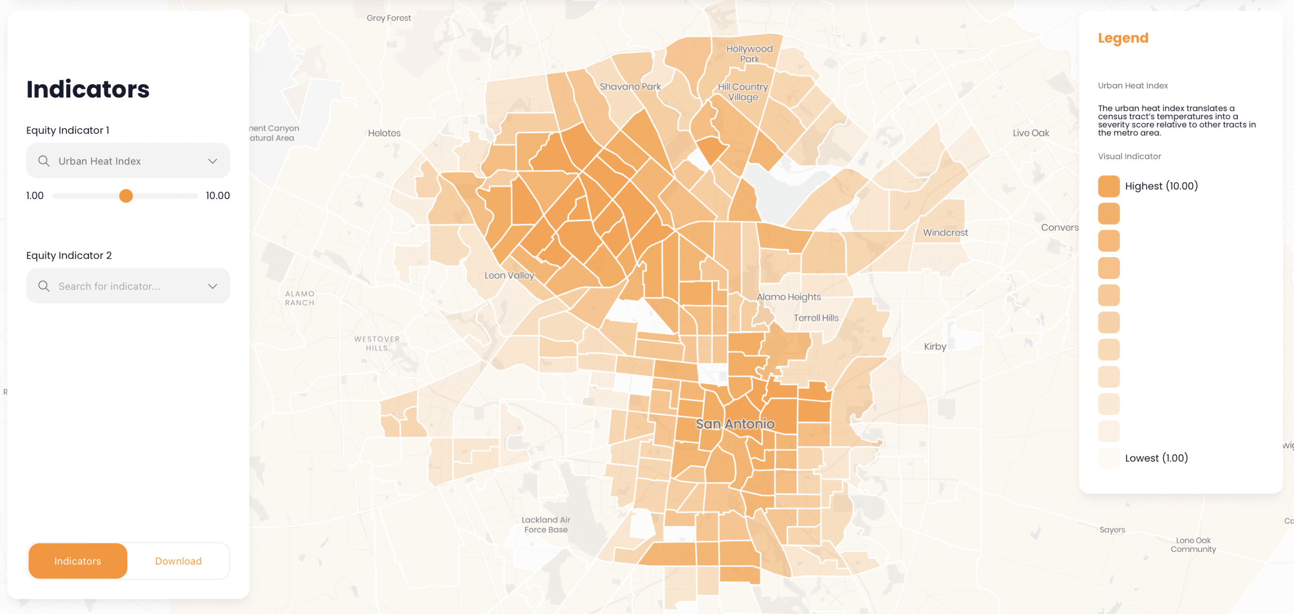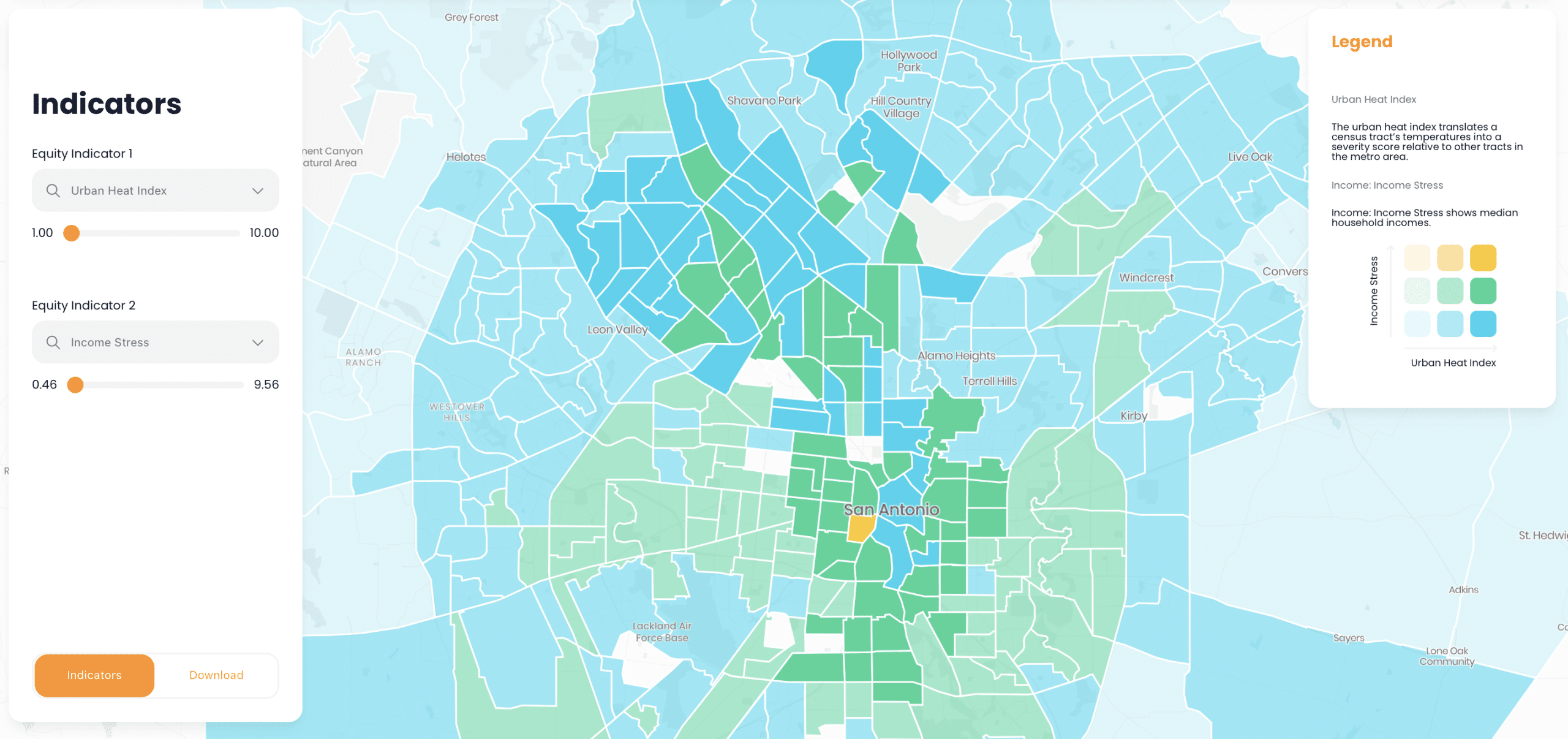 Urban Heat Island: The urban heat index translates a census tract’s temperatures into a severity score relative to other tracts in the metro area.