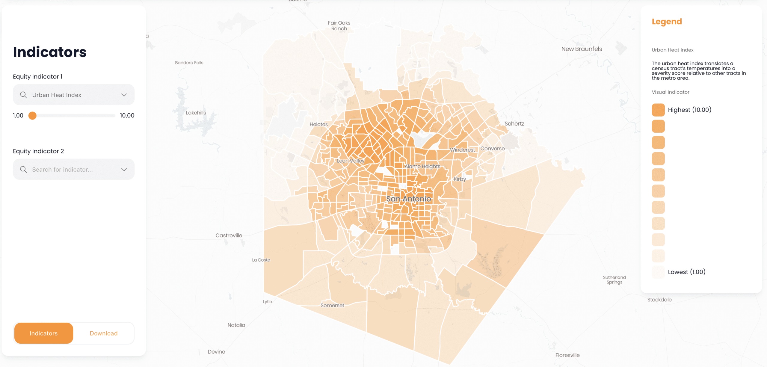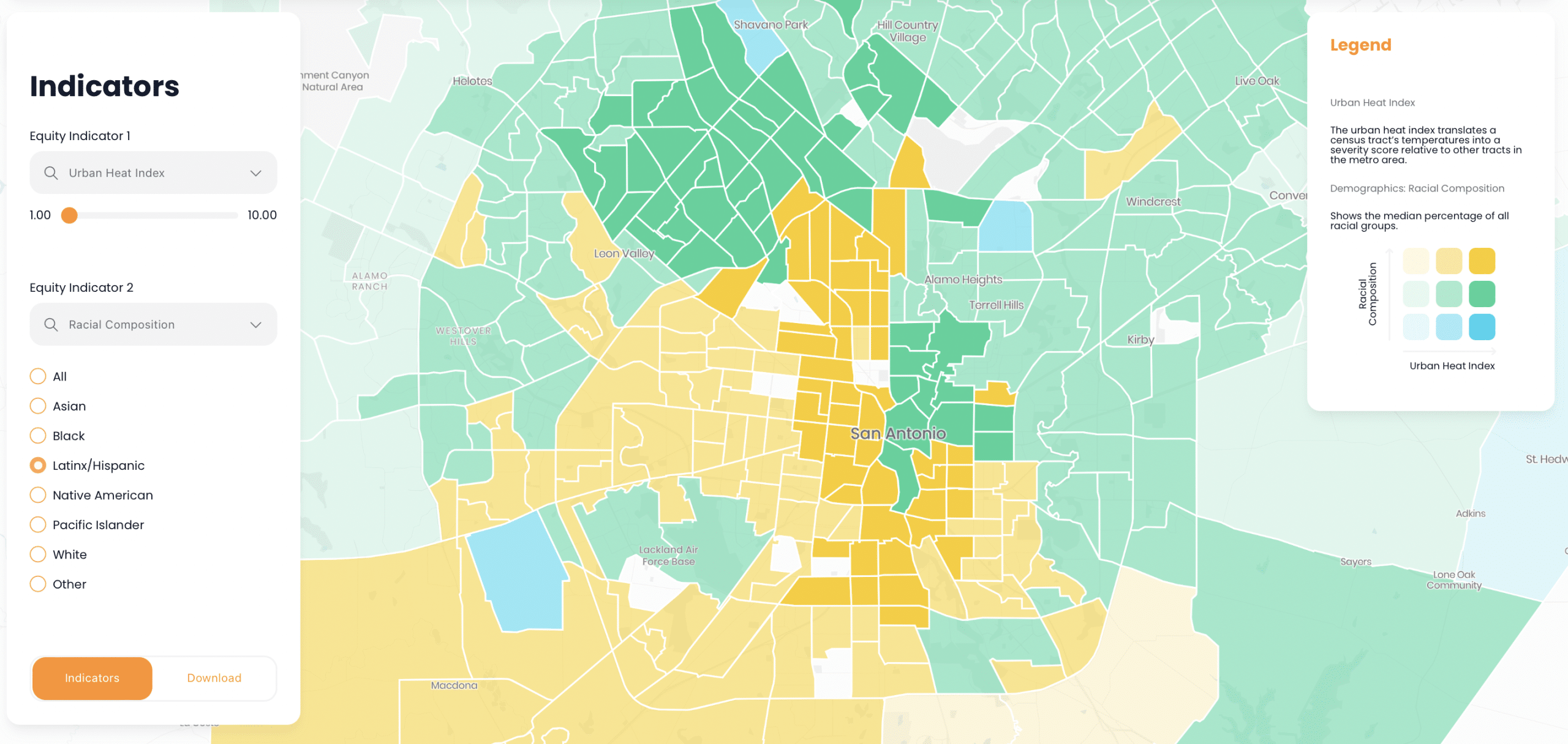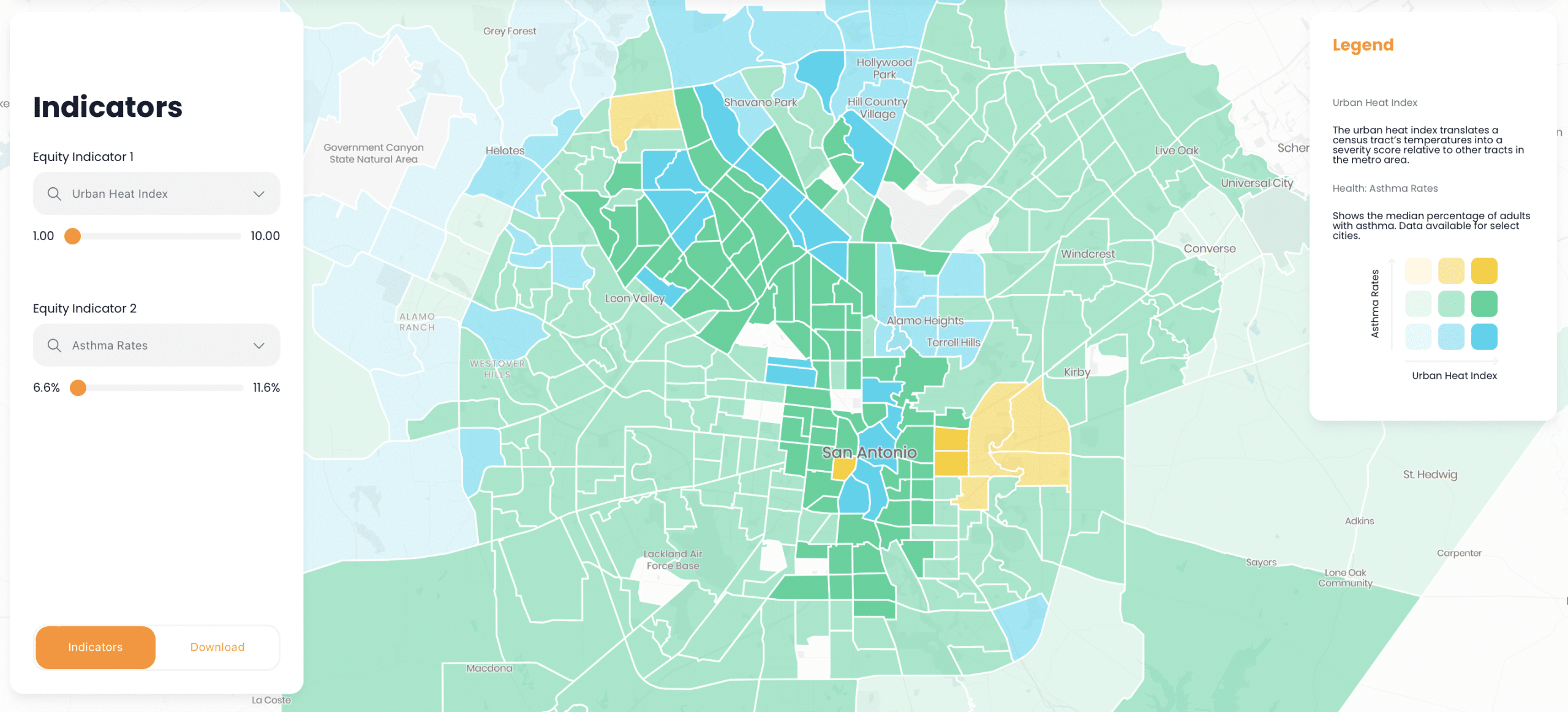 Urban Heat Island: The urban heat index translates a census tract’s temperatures into a severity score relative to other tracts in the metro area.