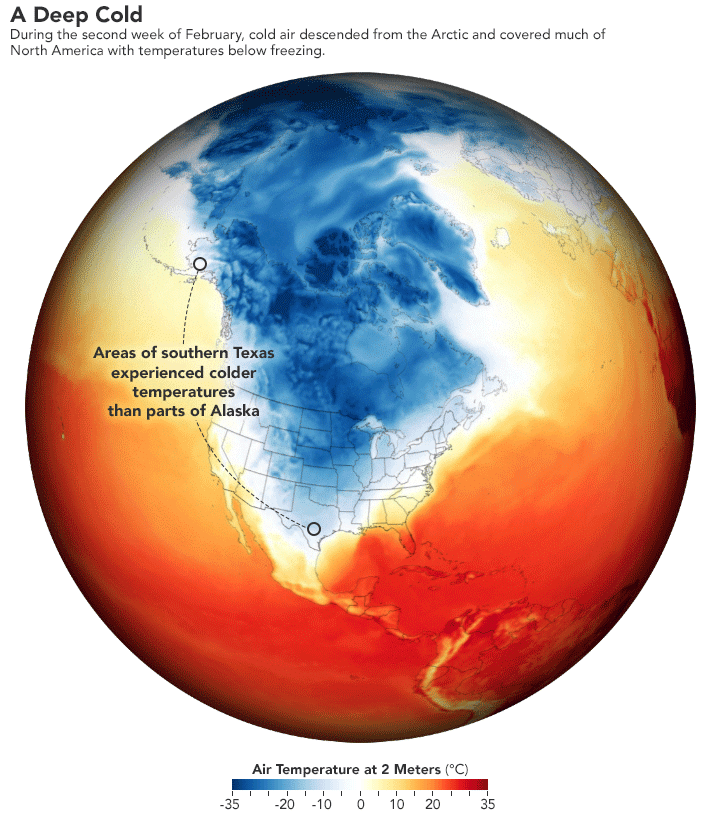 “Texans’ current chill was caused by rapid heating in the stratosphere, the second-lowest section of the atmosphere, 8-50km (5-30 miles) above the Arctic. Known as “sudden stratospheric warming”, it causes the polar vortex – a ring of cold air that encircles the poles – to weaken, lessening the forces that keep cold air corralled at high latitudes. This increases the movement of cold air southward and warm air northward, allowing low temperatures to sweep into typically warm areas such as the southern US.”