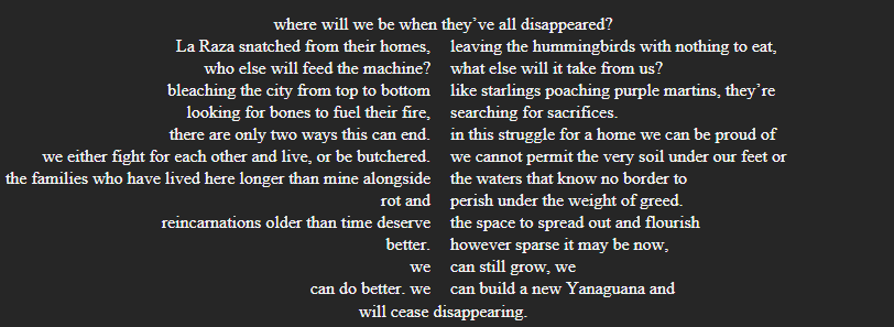 A.J. Floyd (Aria) was born and raised in San Antonio, Texas and takes inspiration from the diversity and vibrant life the city and its people have to offer. When they aren’t agonizing over writing problems they’ve caused themself, they enjoy weaving, shuttle-tatting, reading, and volunteering with the Esperanza Peace and Justice Center. Having had a passion for poetry for roughly fifteen years, they would like to credit Dr. Webb and the Philosophy and Literature Circle for helping them cultivate the confidence necessary to share their love of poetry with others outside of what a class syllabus calls for. They’re currently a student at UTSA and hope to graduate with a degree in Multidisciplinary Studies. Frequent themes in their writing include culture, queerness, disability, community, and sociopolitics. You can reach them at a.j.floyd.writing@gmail.com, or by checking behind the concession booth at an Esperanza event.