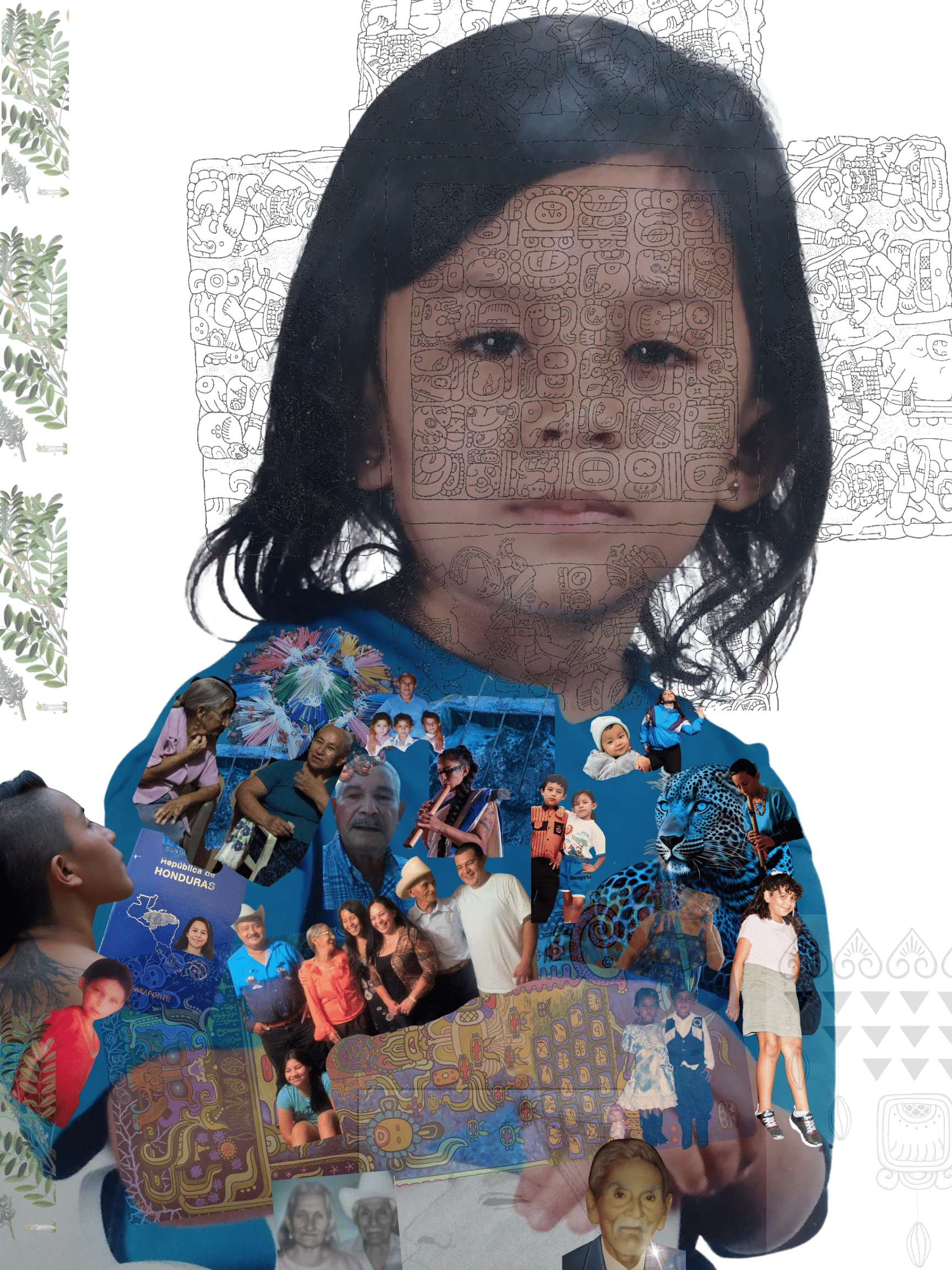 “The collage begins with my kindergarten photo, my face with the Altar Q, the inscribed stone monument of Copán, Honduras. Altar Q records the sixteen rulers of Copán’s dynastic line, carved into its four sides and crowned with hieroglyphic inscriptions. On the shirt, I layered images of family, ancestors, and Mayan fire offerings, weaving together lineages of memory and ceremony.
