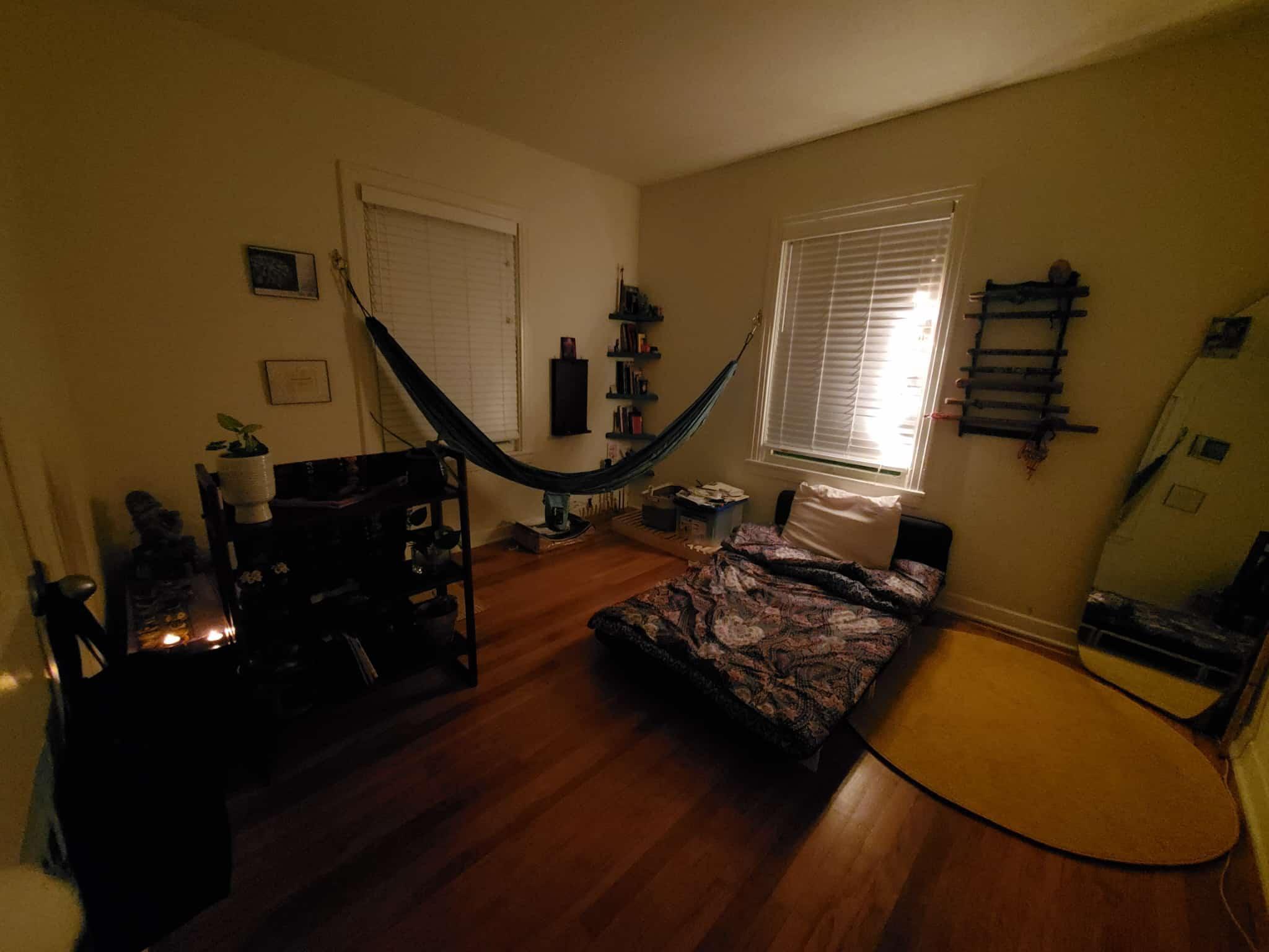 The 5 wooden triangles hang alone in the corner of the room where the walls meet. A hammock that can withstand 500 pounds, or so they say, hangs in front diagonally from those 2 walls. They stretch out to meet my altar where I prayed for about 4 years, burning illegal candles late at night when my landlord wouldn't find out. There, I sobbed, laughed, and expressed my gratitude. Above it all the Indigenous cosmology I was learning. They were activating blood lines, returning me to my root.