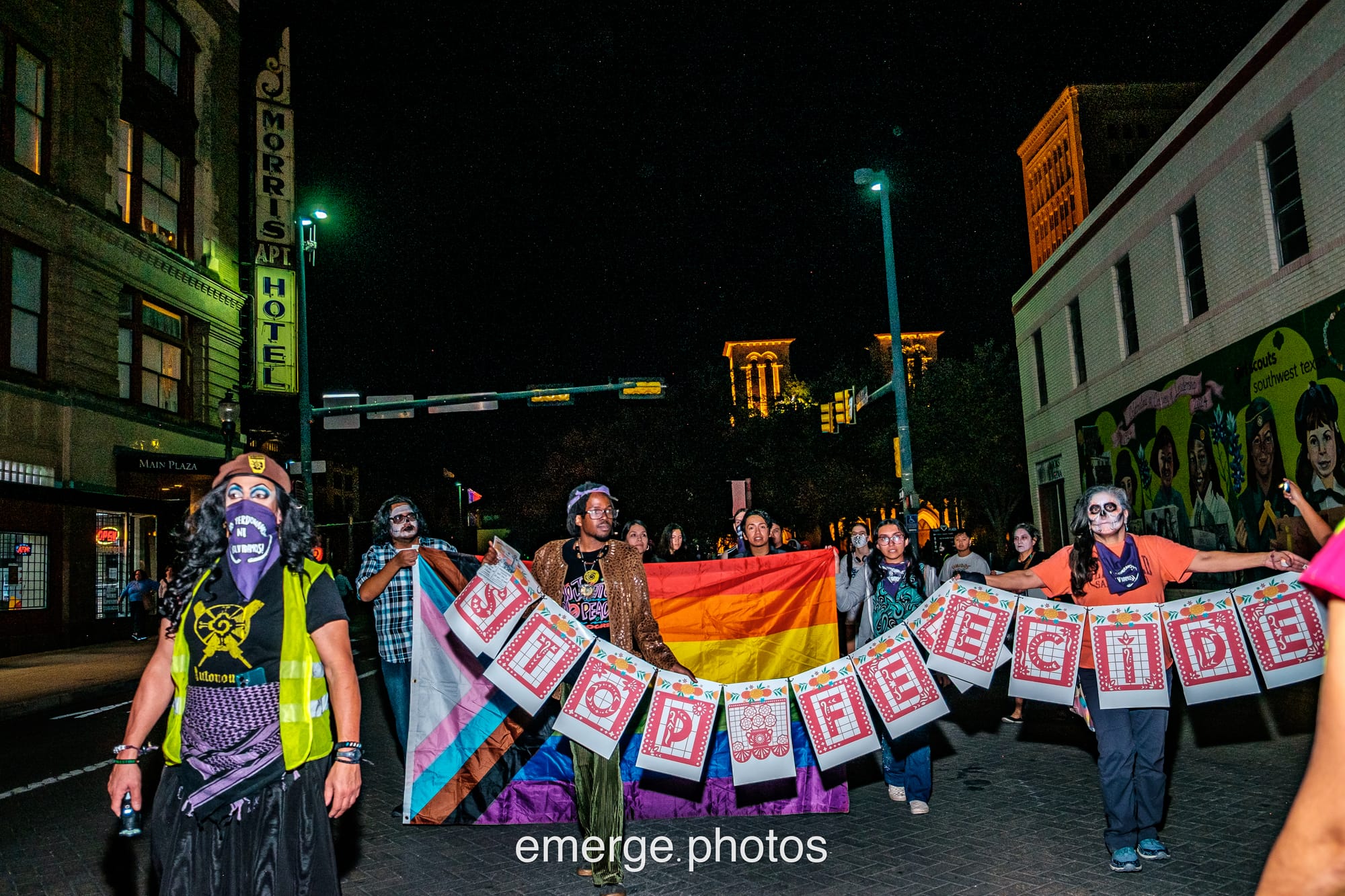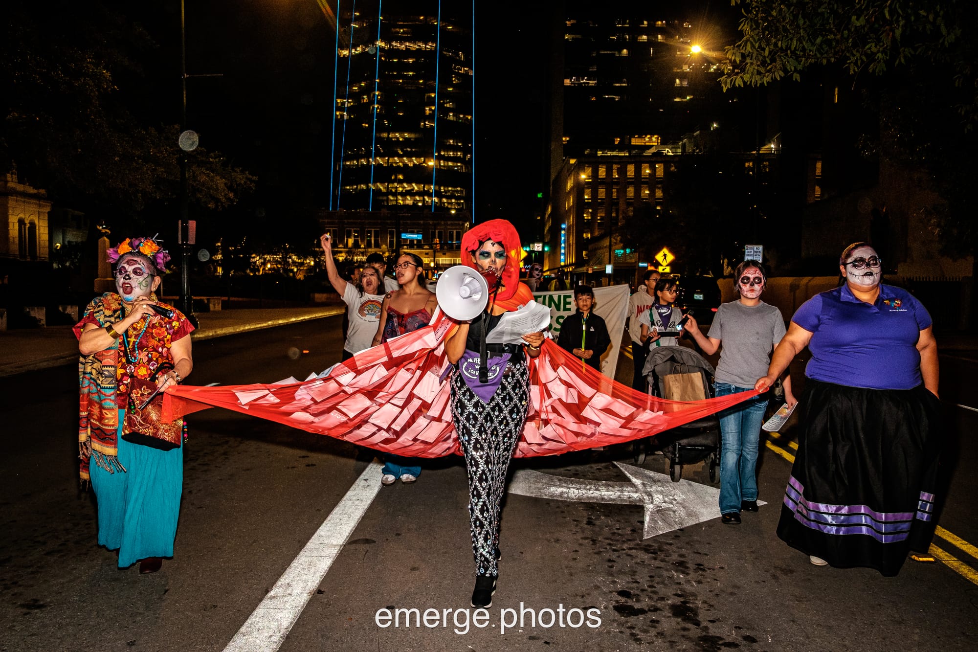 Participants at Catrinas March and Rally to Stop Femicide in San Antonio decry femicide, transfemicide, and homophobic murders. Deceleration Video