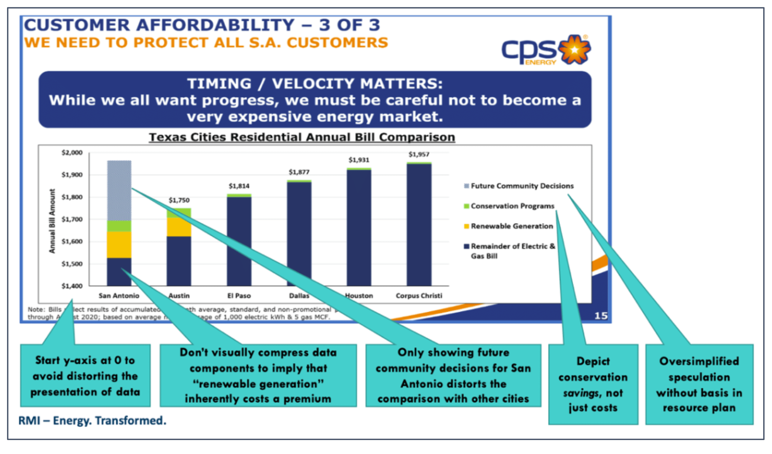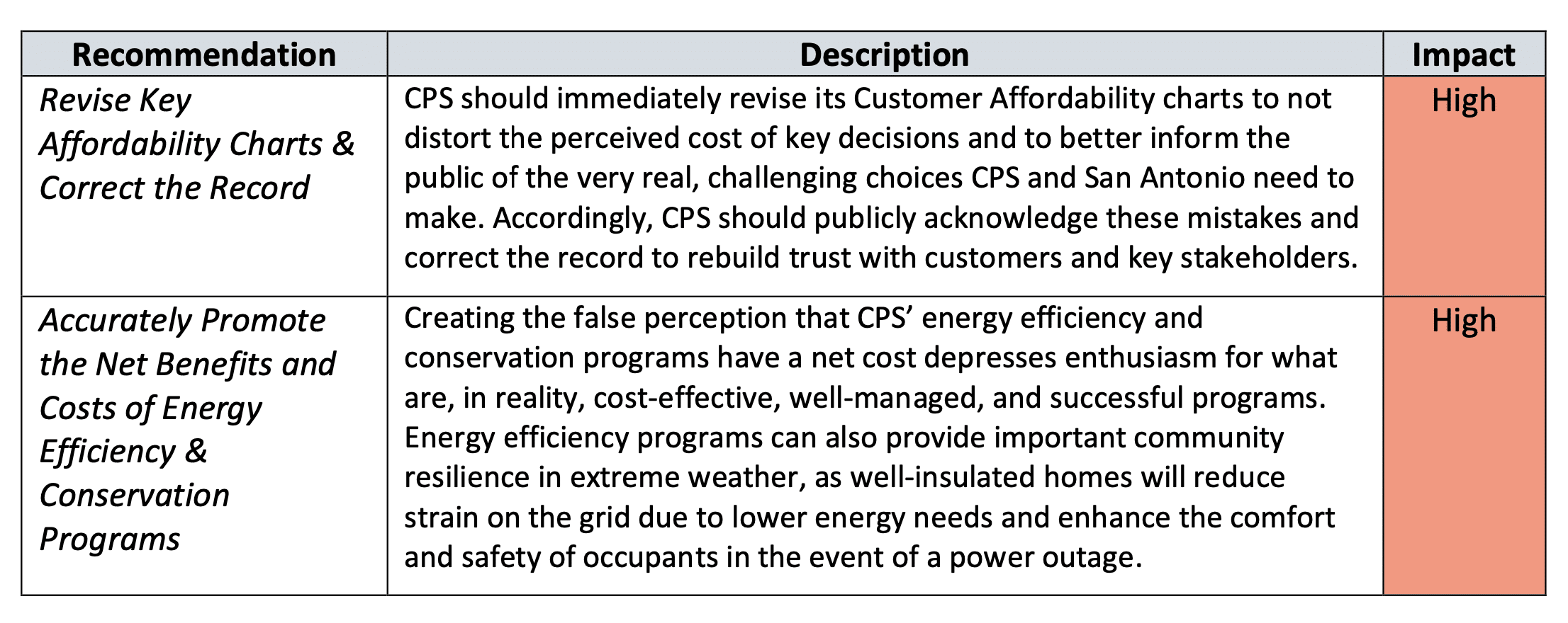 “CPS should immediately revise is Customer Affordability charts to not distort the perceived cost of key decisions and to better inform the public of the very real, challenging choices CPS and San Antonio need to make. Accordingly, CPS should publicly acknowledge these mistakes and correct the record to rebuild trust with customers and key stakeholders.”