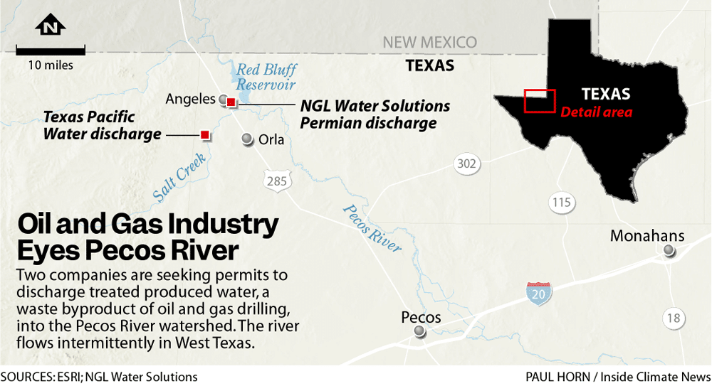 The Texas Commission on Environmental Quality issued a permit for a company to discharge produced water in Atascosa County, southeast of San Antonio in the Eagle Ford Shale basin, earlier this year and is reviewing another application near Eagle Pass. A second company has also applied to discharge into the Pecos River watershed.