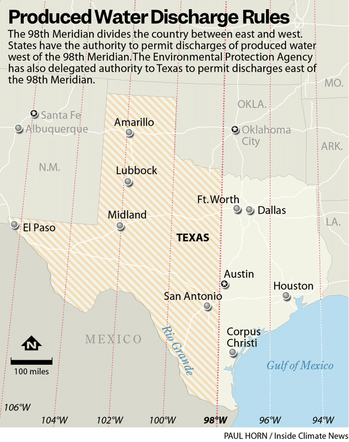 West of the 98th Meridian, a north-south line that roughly divides the arid West from the water-rich East, the Environmental Protection Agency delegates authority to states to permit discharges of produced water into bodies of water. EPA numerical standards for produced water discharges only cover oil and grease, leaving states to determine what other constituents to regulate.