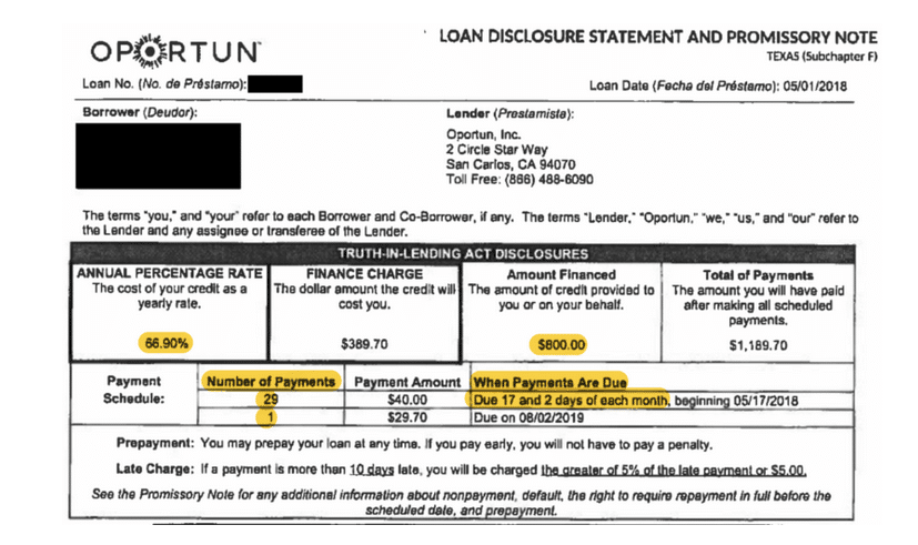 In May 2018, Oportun lent $800 at a 66.9% interest rate to a woman in McAllen, a city on the Texas-Mexico border, who needed it to pay rent. The terms: 15 months with bimonthly payments of $40. (That meant she would have paid a total of $1,189.70, including $389.70 in interest.)