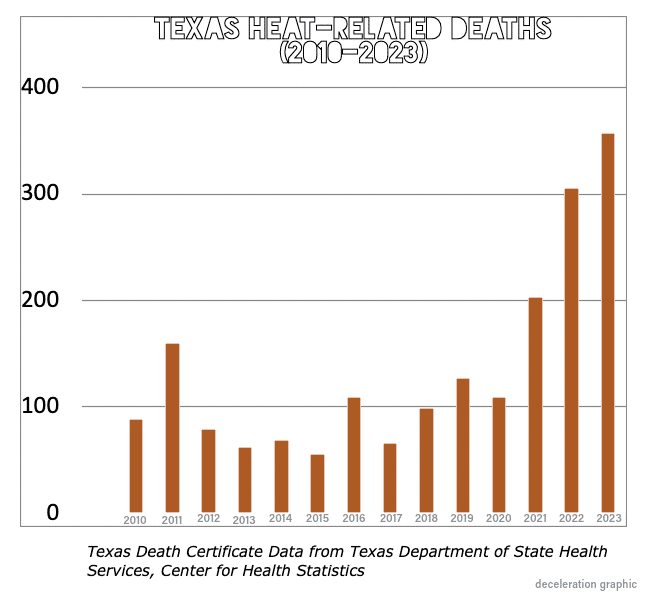 There are innumerable short-term actions required to reduce suffering during this period of expanding heat. Proper accounting of heat’s actual impacts is square one. This is why Deceleration launched a petition to urge Bexar County’s Medical Examiner and San Antonio’s Metro Health to prioritize the tracking and recording of heat deaths.